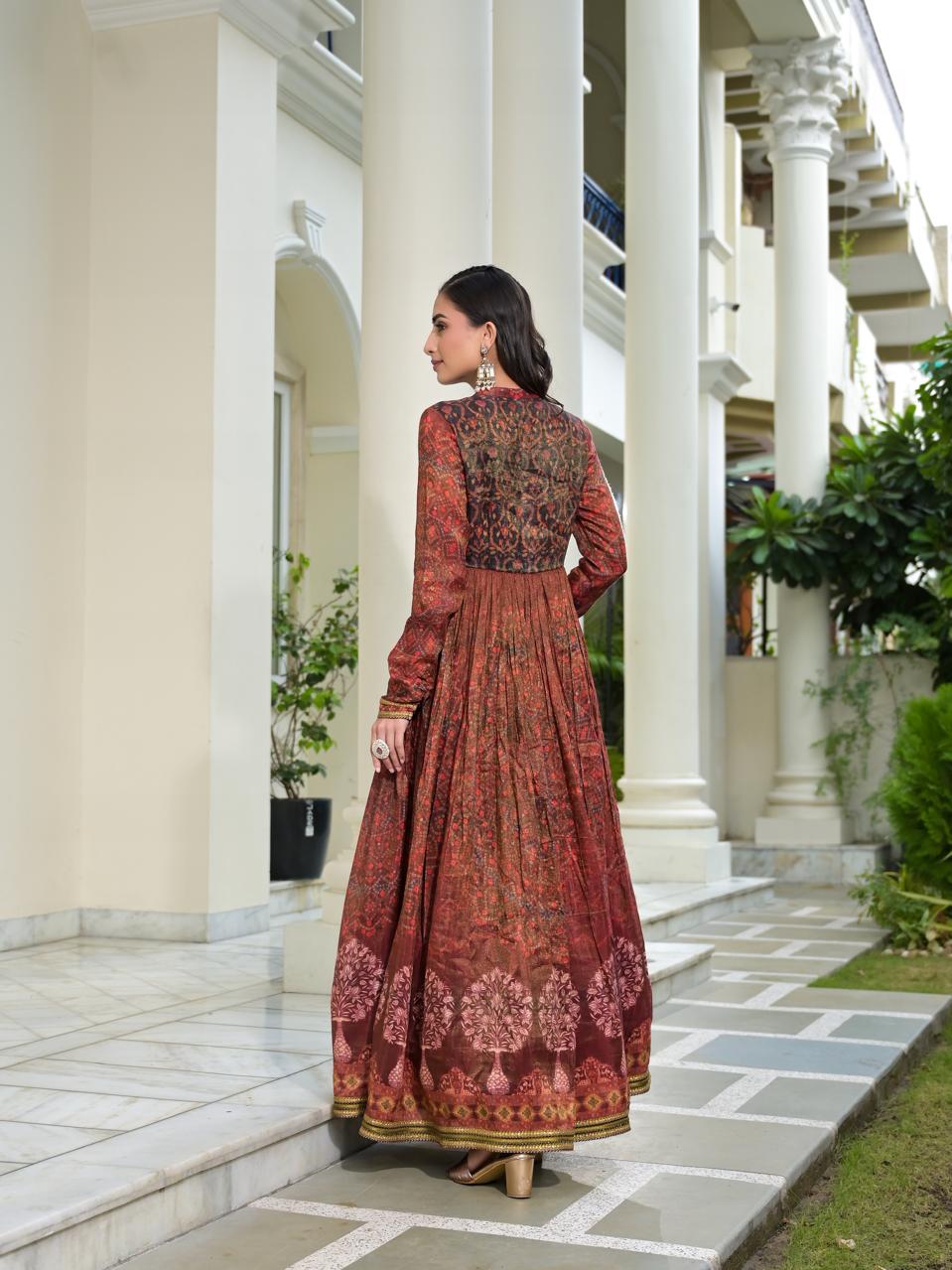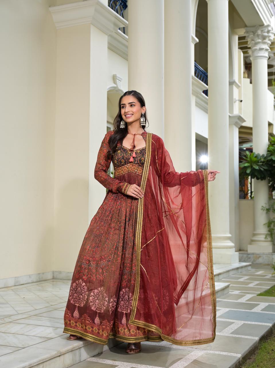 Look mesmerizing and exude elegance in the Nayab Ananta Red Kurta Set with Dupatta. Step into elegance with this regal ensemble, featuring a stunning printed maroon Anarkali gown paired with a sheer red dupatta. The gown is adorned with intricate patterns inspired by traditional Indian motifs, creating a captivating blend of heritage and style. Its flared silhouette gracefully drapes to the floor, showcasing beautiful golden borders and artistic tree designs along the hemline. The bodice is embellished with delicate threadwork, highlighted by a tasseled tie-up neckline, adding a playful touch of charm. The accompanying dupatta, crafted from a soft, flowy fabric, is edged with a classic golden border, perfectly complementing the gown's rich tones. The full-sleeved design and luxurious fabric make this outfit a perfect choice for festive events, weddings, or any occasion where you want to exude timeless grace.