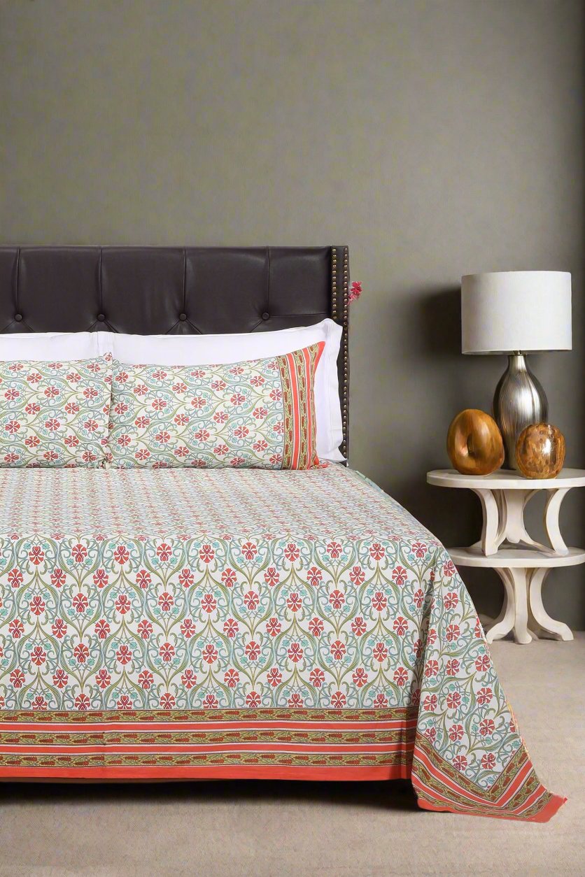 This printed bedsheet is carefully crafted from concept design to finished product, it is authentically printed by master craftsman meticulously on cambric cotton adorning beautiful natural elements of the beautiful flora and fauna and patterns as well as motifs of Indian origin. This product is meticulously made in India.