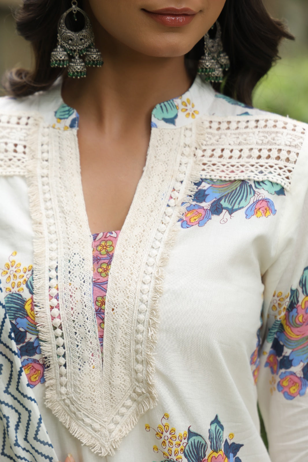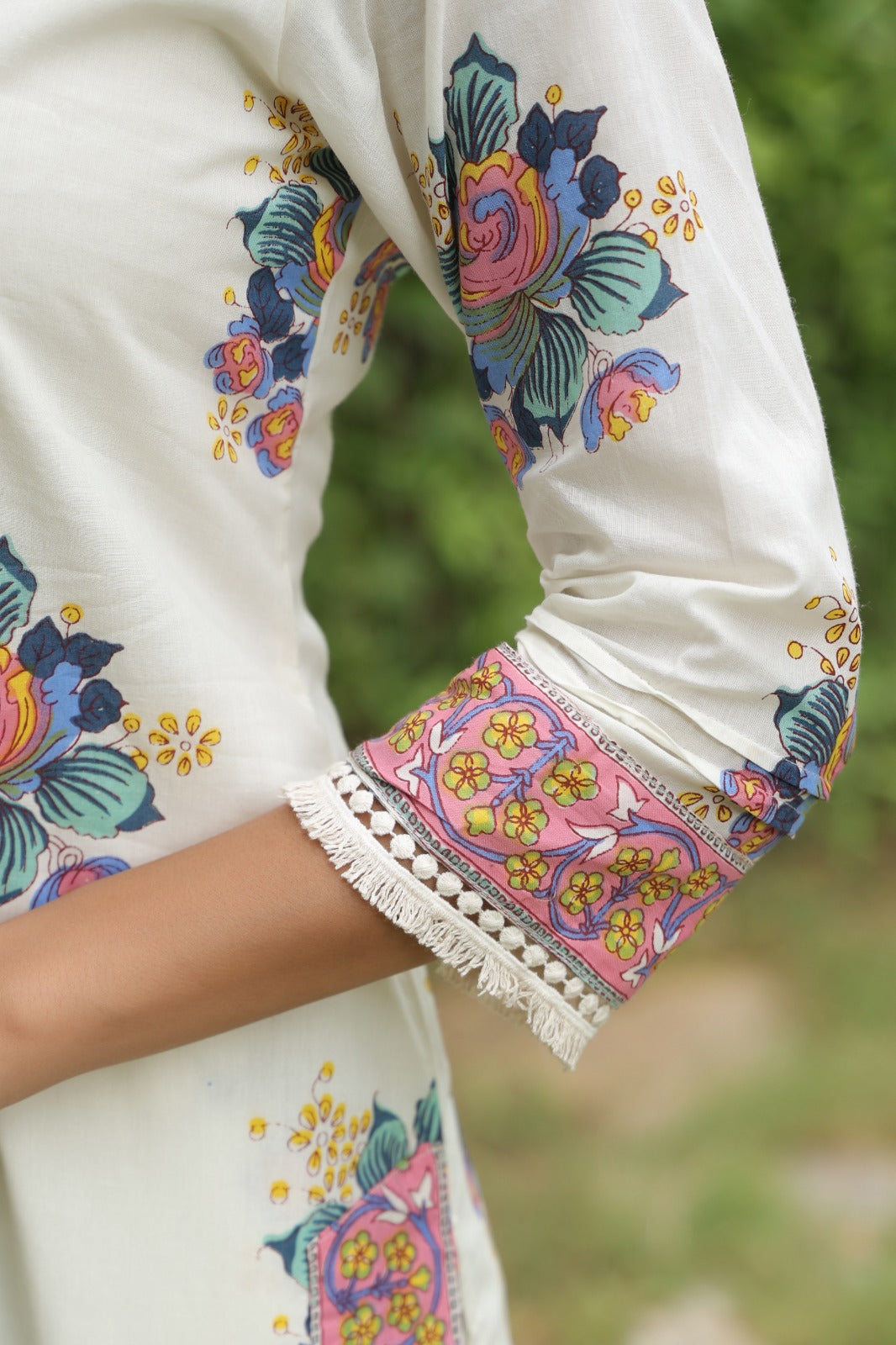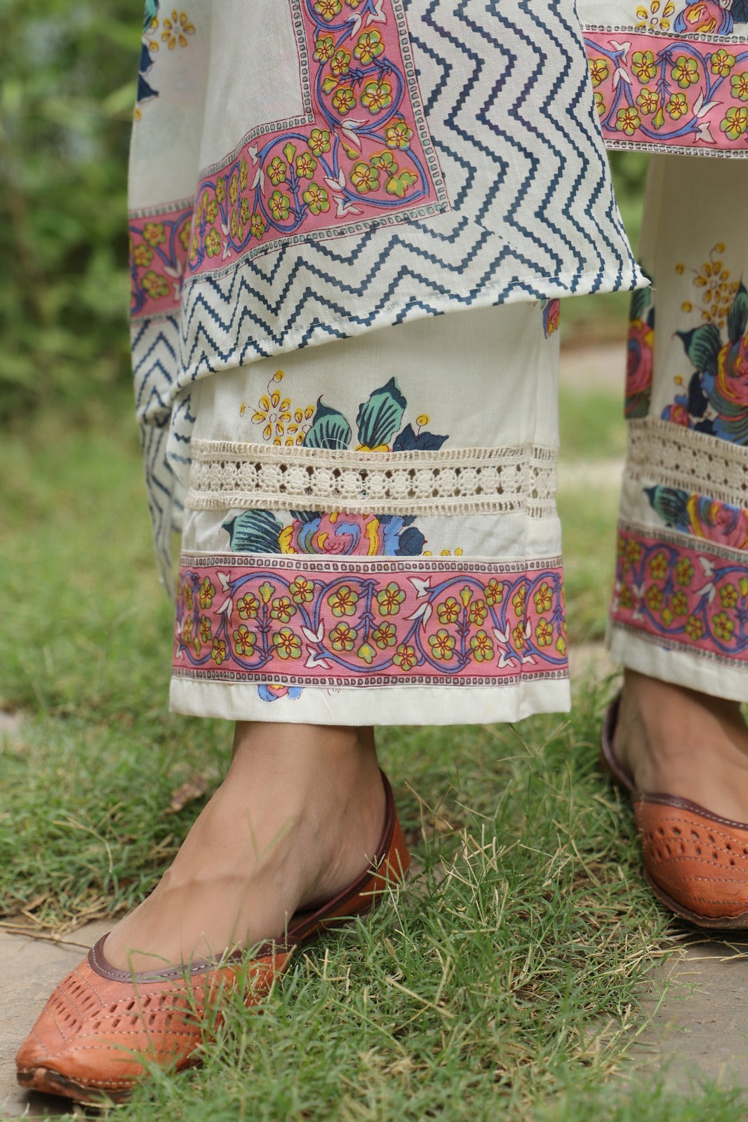 "Gulnaaz" embodies the essence of graceful charm, featuring thoughtfully tailored silhouettes and exquisite detailing. Crafted from 100% natural, breathable, high-quality cotton fabrics, this set is a perfect choice for summer wear. The meticulous craftsmanship and attention to detail ensure that this product is made with care and precision in India.