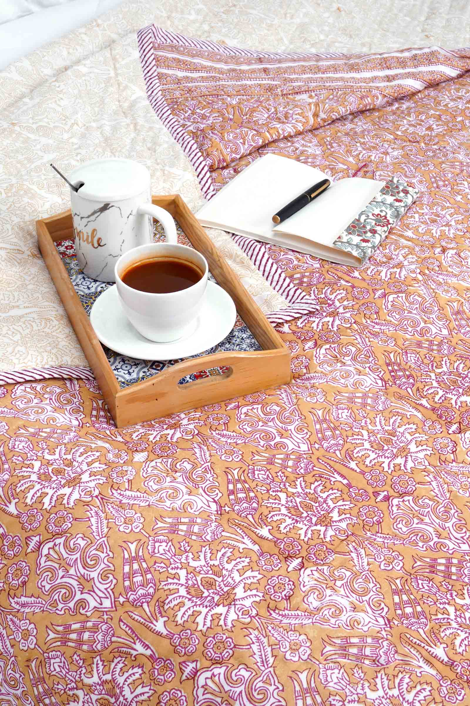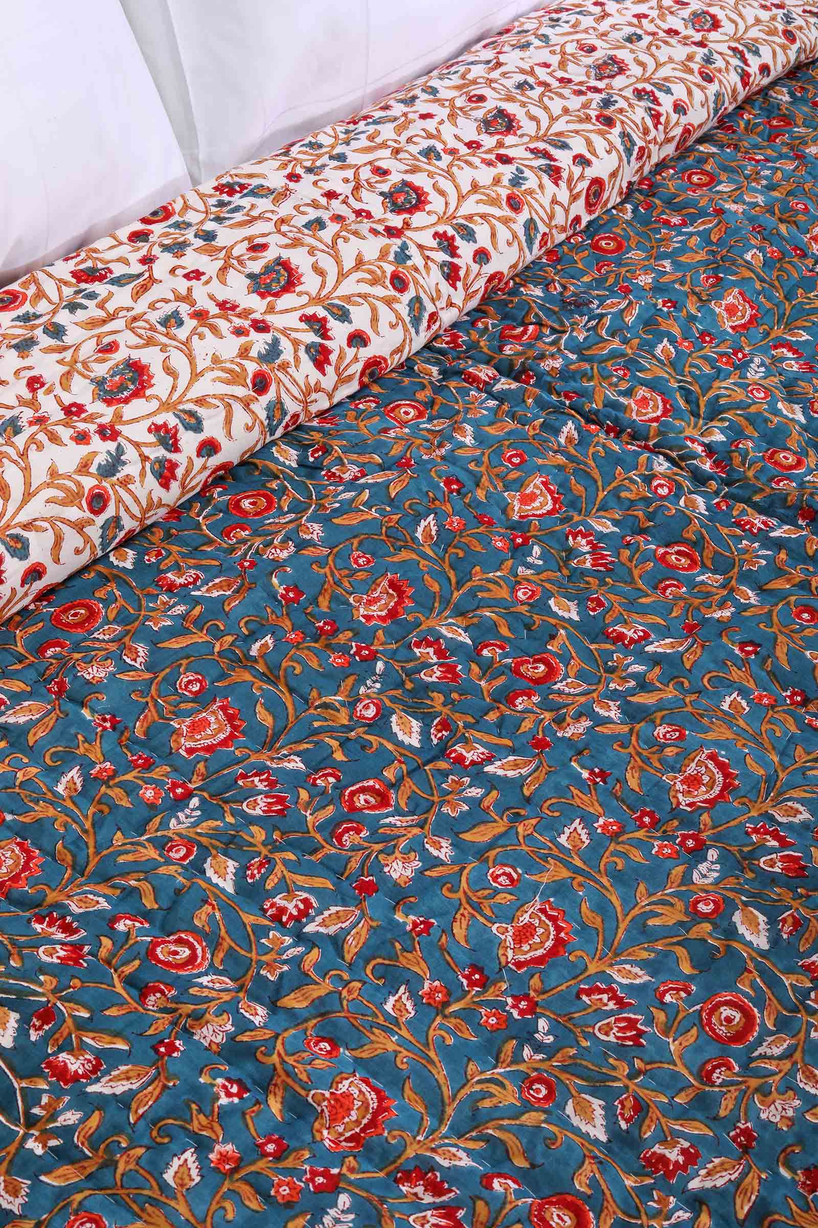 Every hand block quilt is a work of dedication. Skilled artisans carve wooden blocks, mix natural dyes, and print each section of fabric by hand with care and precision. When you bring home a hand block printed quilt, you bring home real craftsmanship and tradition—something no mass-produced quilt can offer.