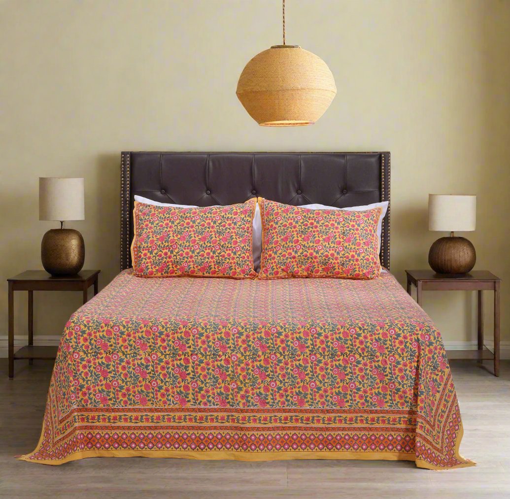 This block printed bedsheet is carefully crafted from concept design to finished product, it is authentically block printed by master craftsman from carved wooden blocks meticulously printed on cambric cotton adorning mughal garden elements of poppies, cypress trees and spring flowers, hemmed with architectural trellises and borders. This product is made in India.
