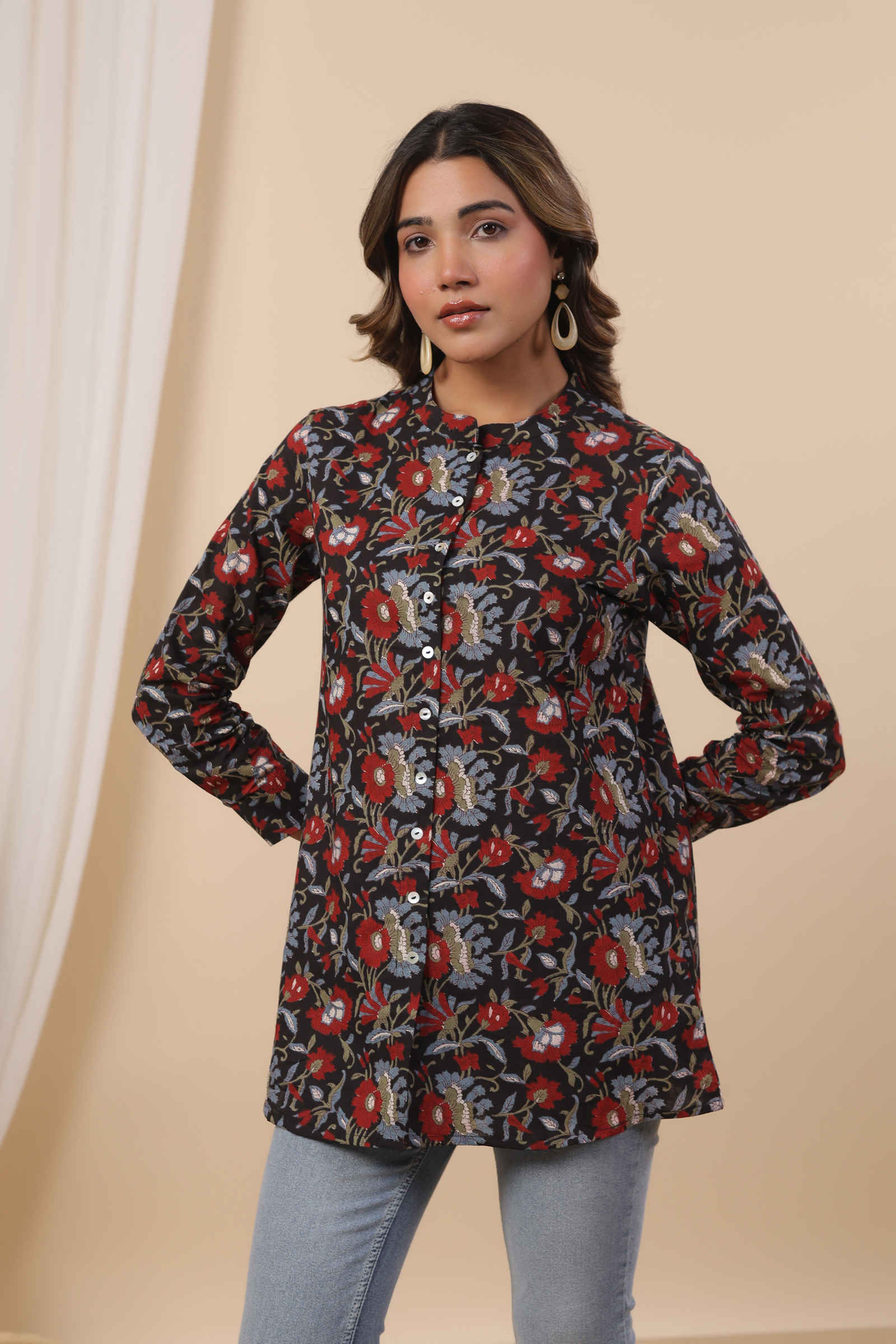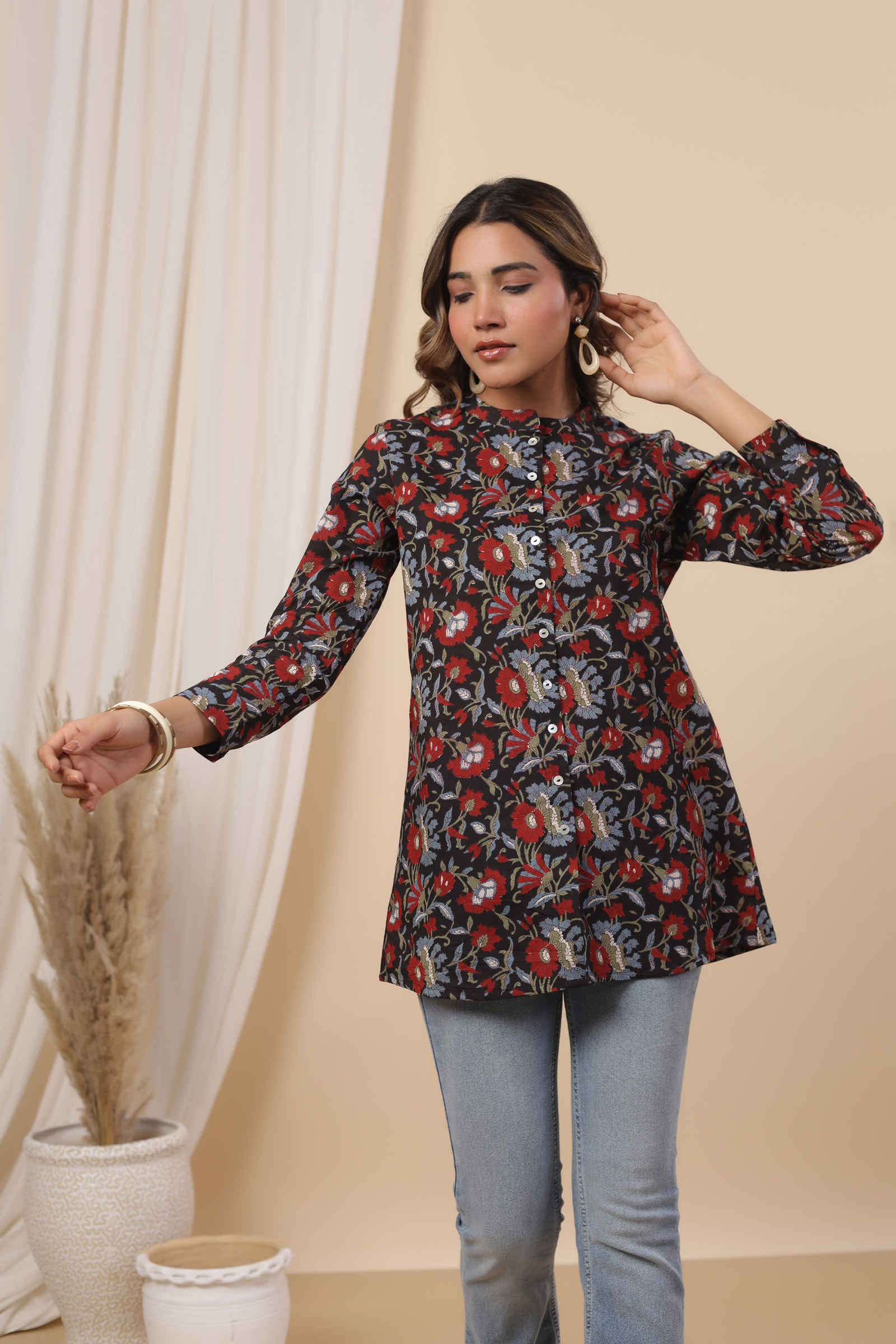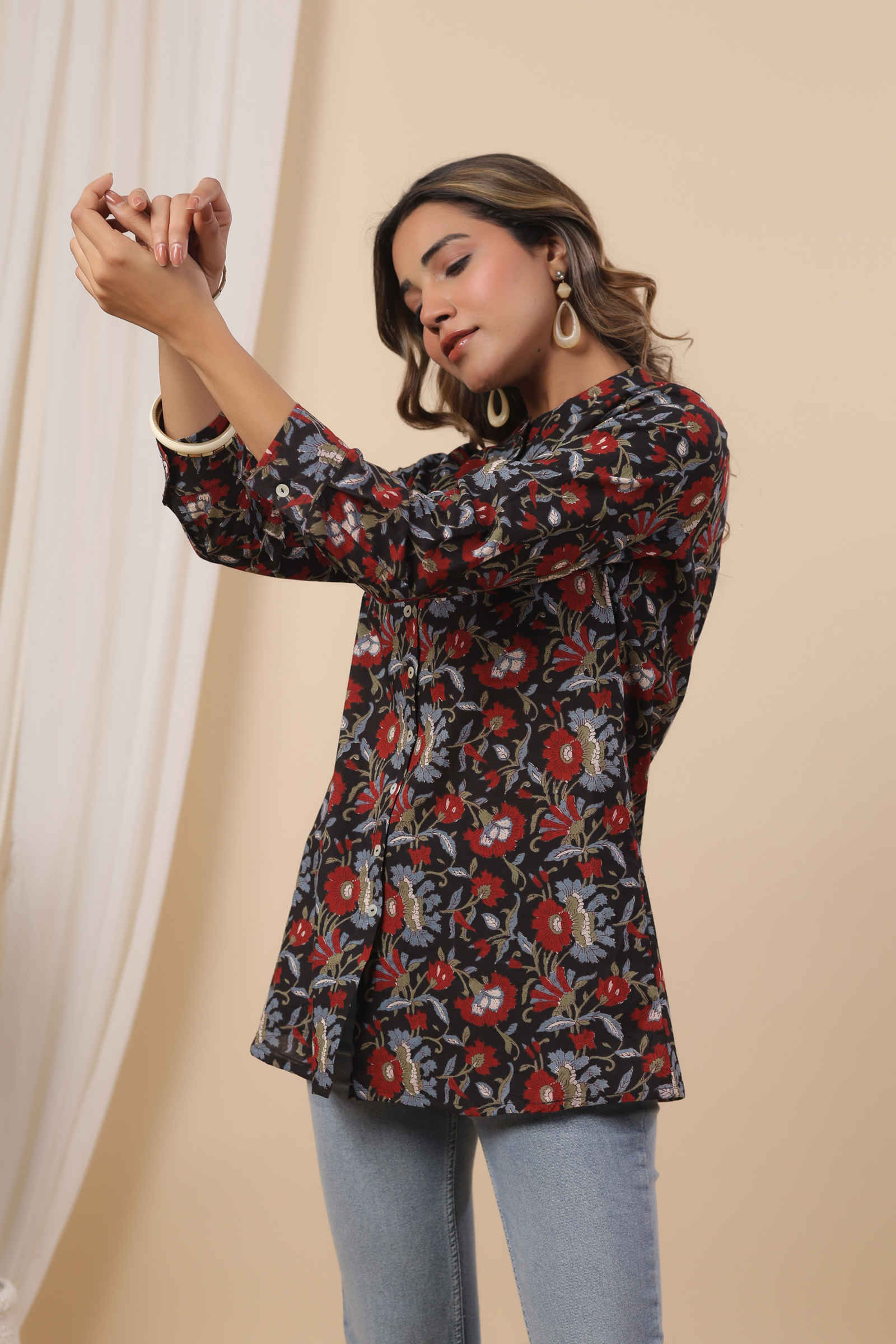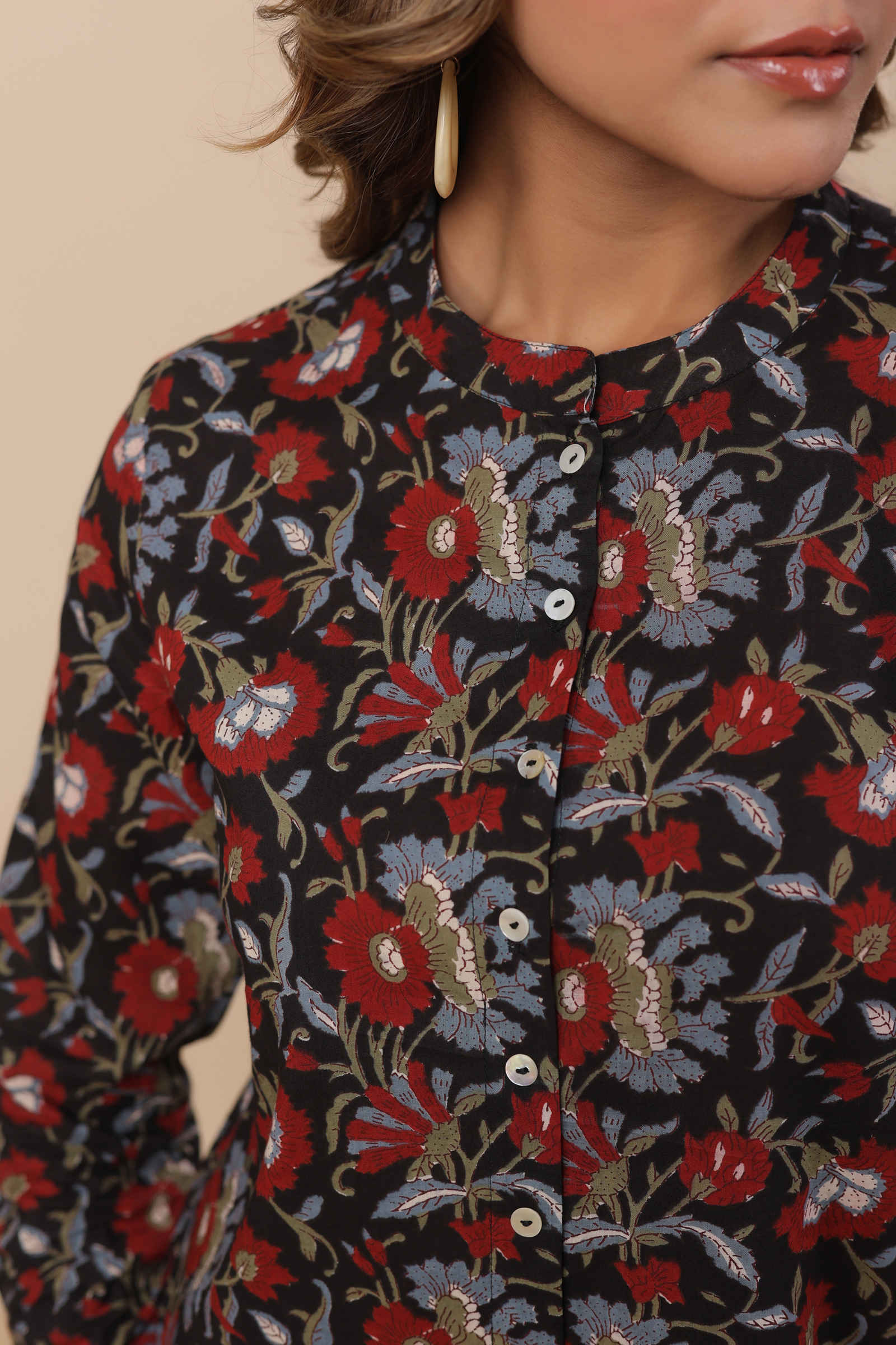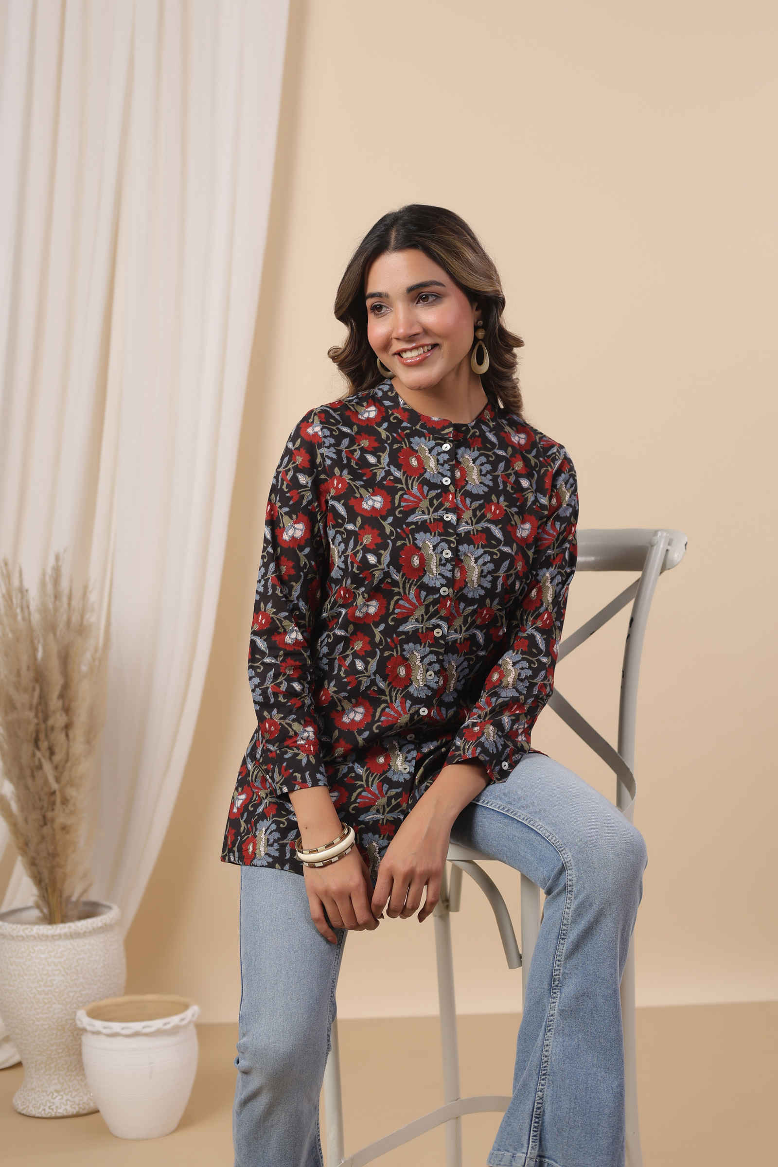 Embrace a regal elegance with the Ulfat Noorjehan Black Printed Top. Crafted from breathable and soft cotton, this exquisite piece features a rich floral print in red, grey, and blue over a sophisticated black base. With its classic button-down front and full sleeves, this top effortlessly blends traditional artistry with contemporary style.