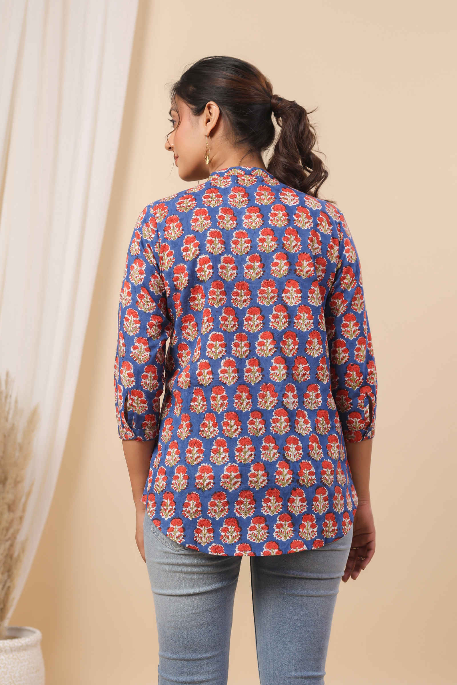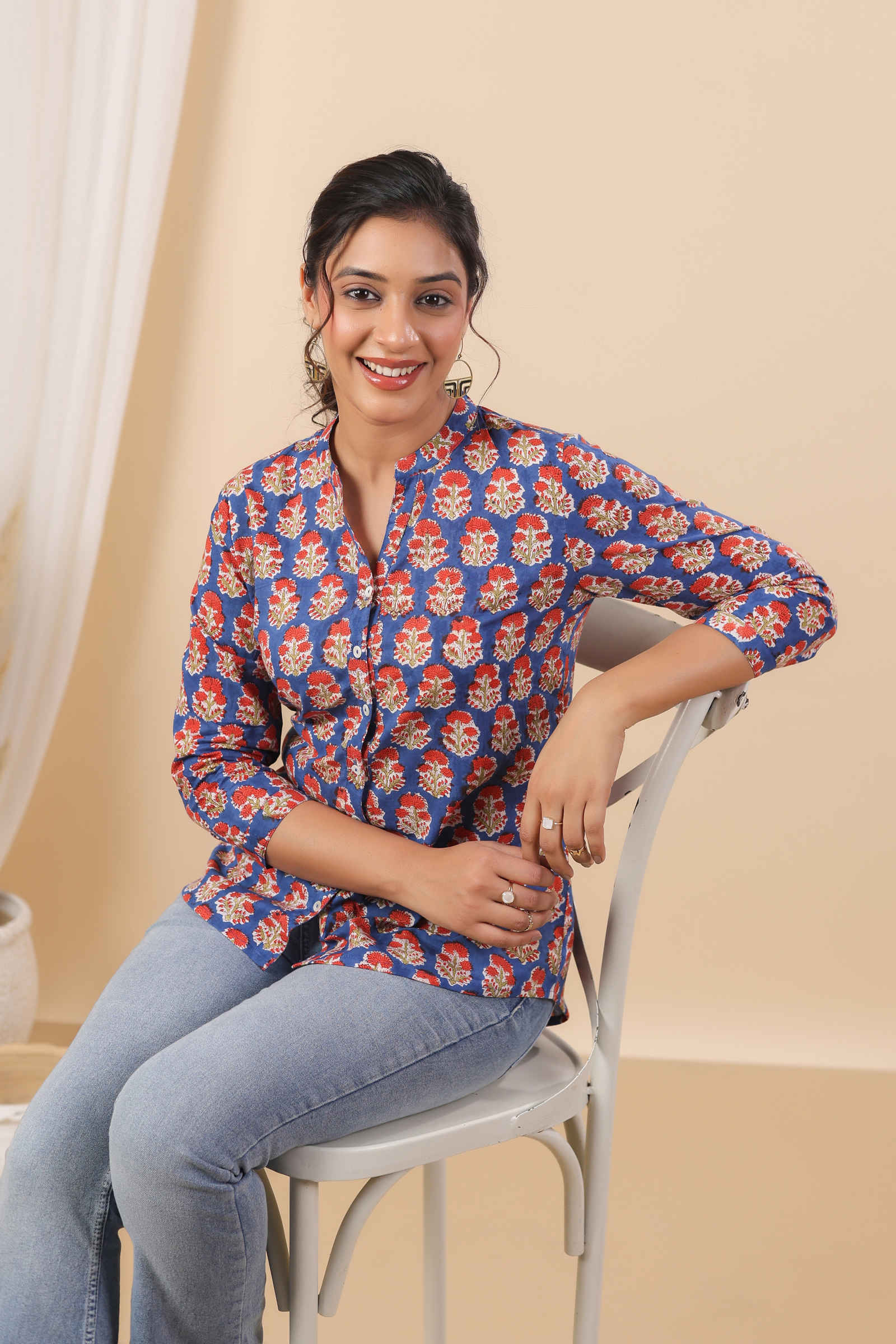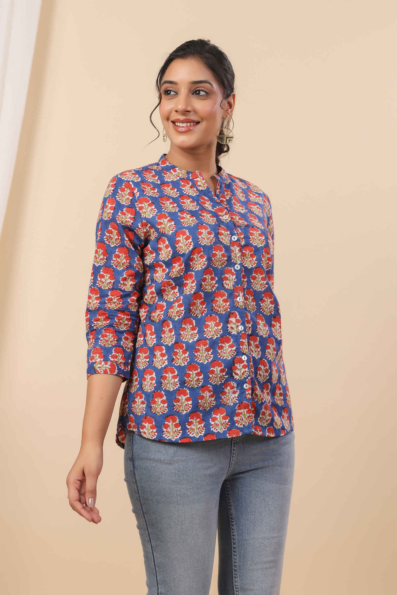 This top is perfect for the summer season. Crafted from breathable and soft cotton, it features an exquisite red floral print with delicate detailing. The straight-cut silhouette ensures a flattering fit, while the three-quarter sleeves and mandarin collar add a touch of elegance. A button-down front enhances its classic yet contemporary charm. Comfortable and stylish, this top is an essential addition to your summer wardrobe.