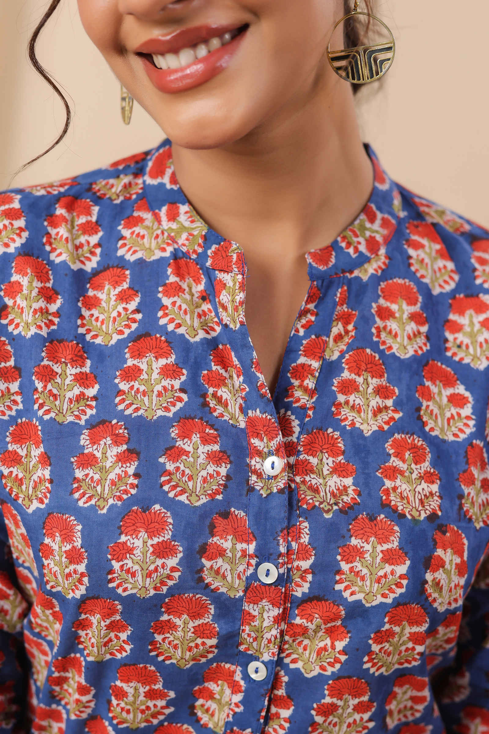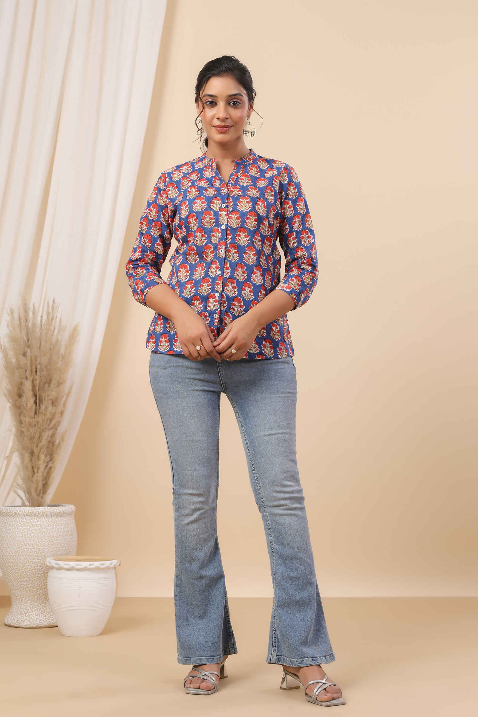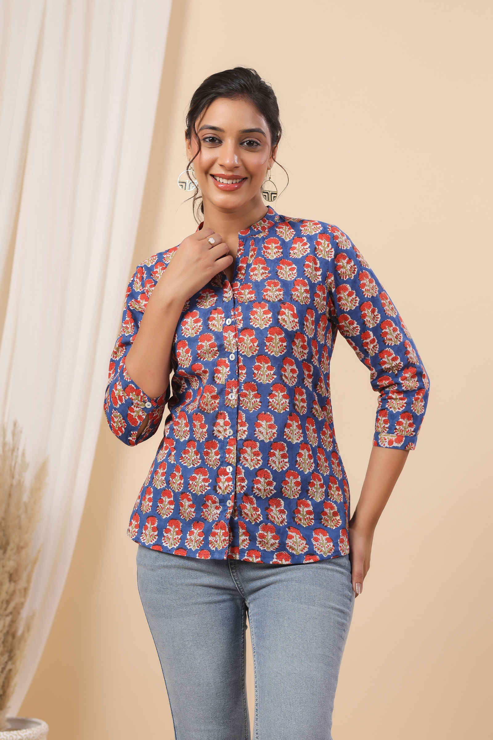 This top is perfect for the summer season. Crafted from breathable and soft cotton, it features an exquisite red floral print with delicate detailing. The straight-cut silhouette ensures a flattering fit, while the three-quarter sleeves and mandarin collar add a touch of elegance. A button-down front enhances its classic yet contemporary charm. Comfortable and stylish, this top is an essential addition to your summer wardrobe.