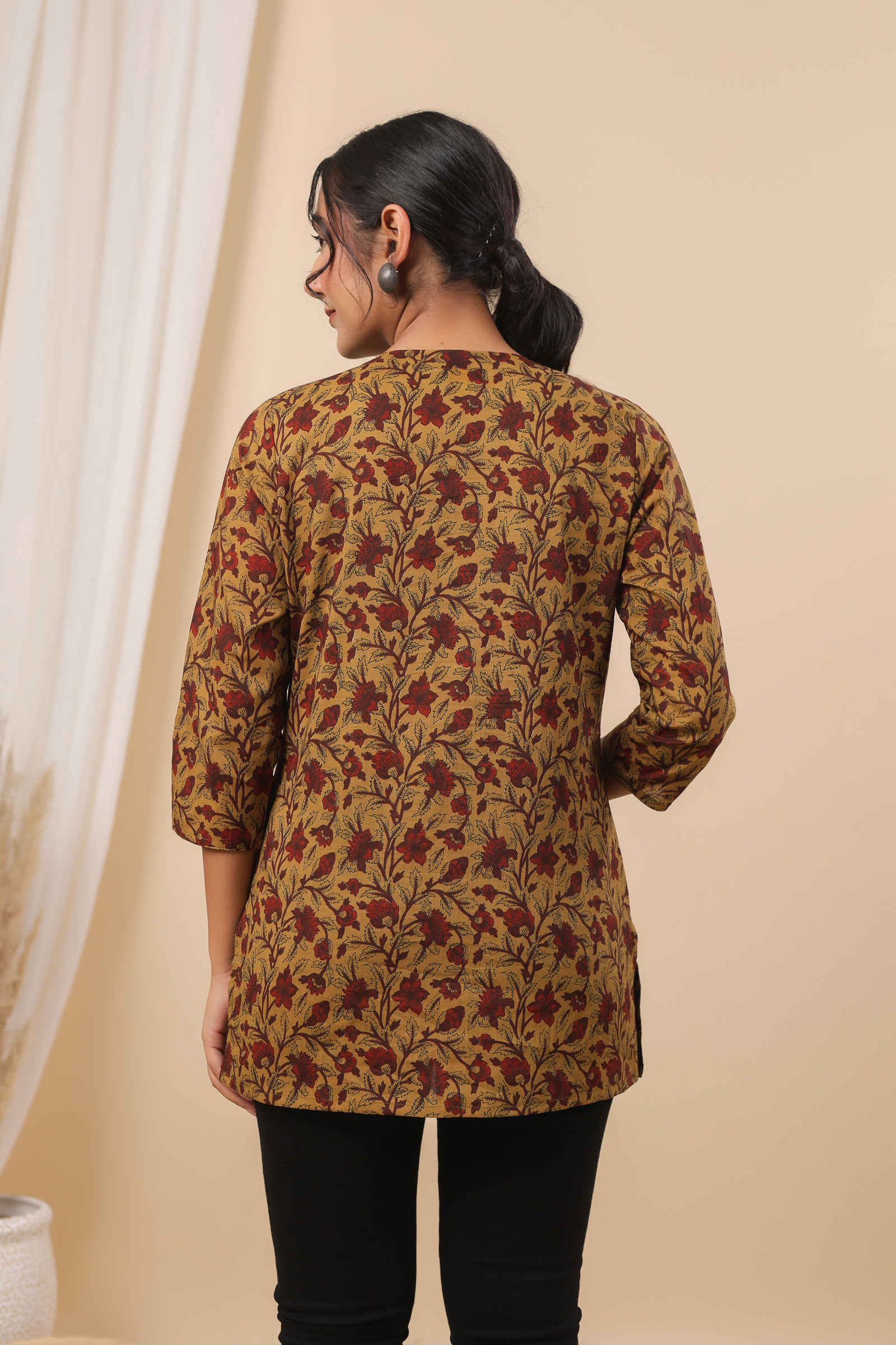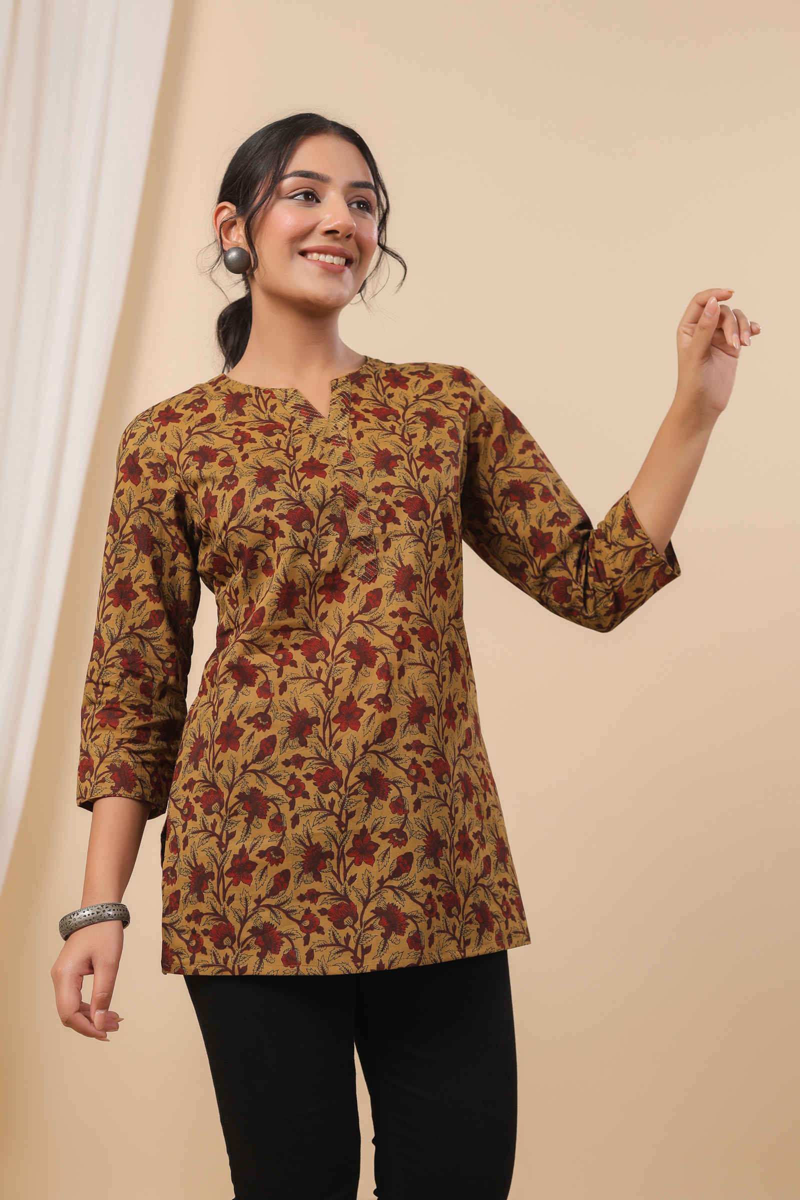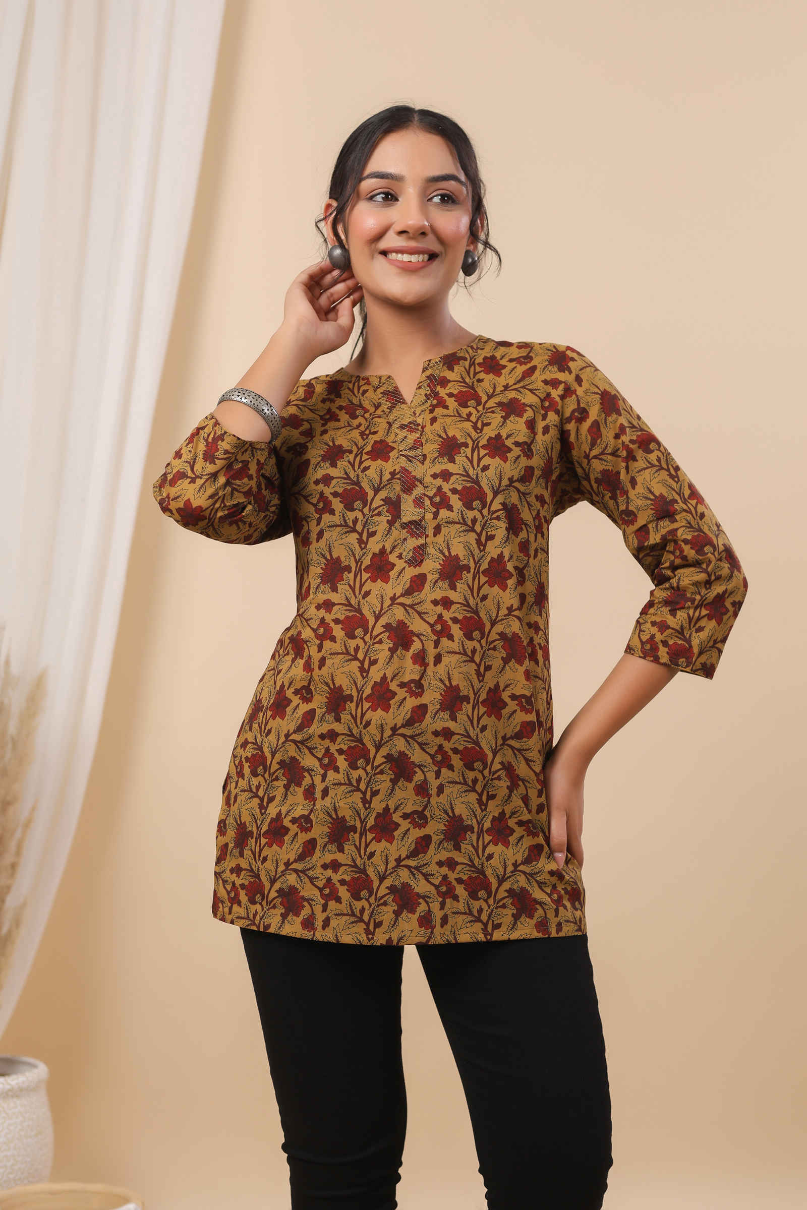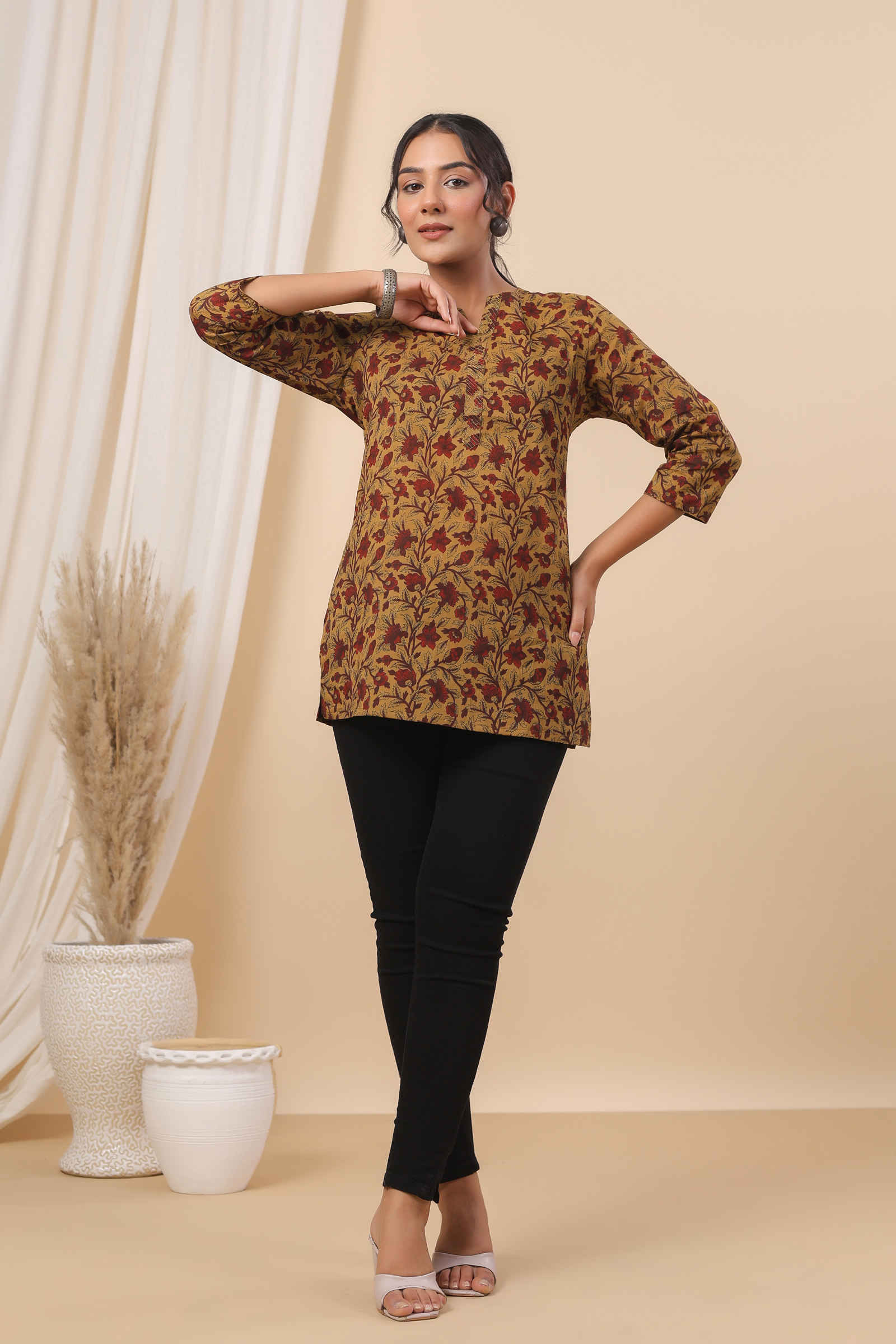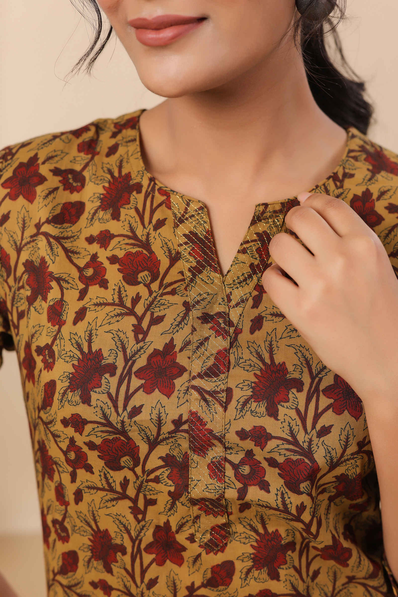 - Mustard base with elegant red and brown floral print