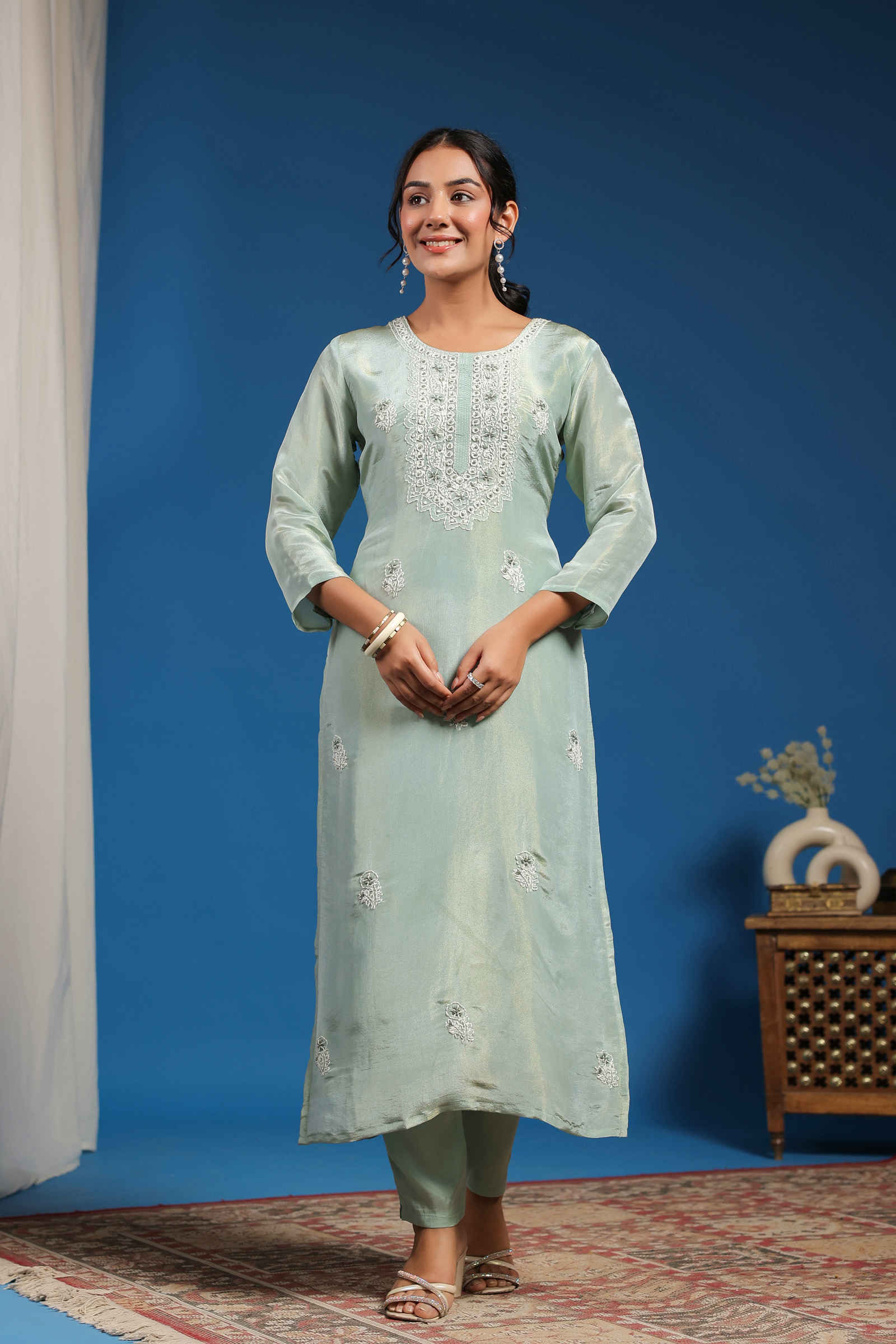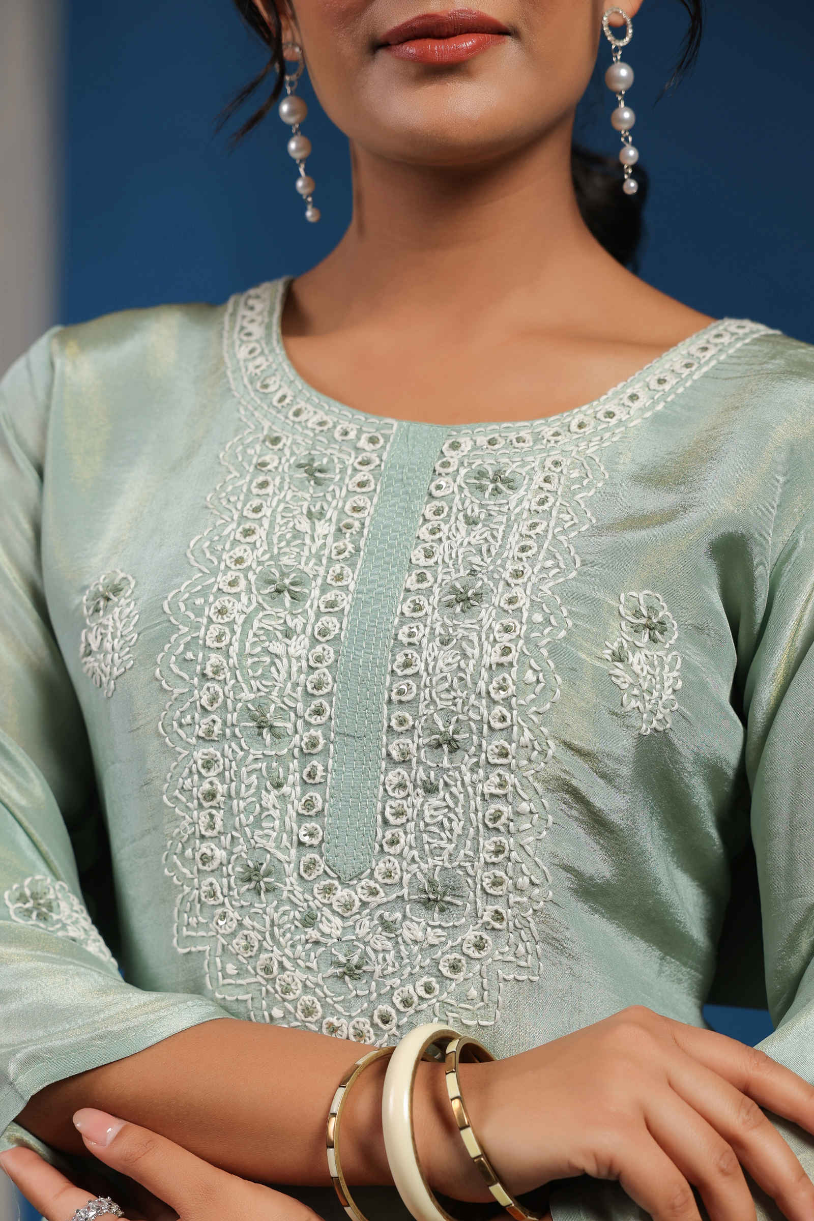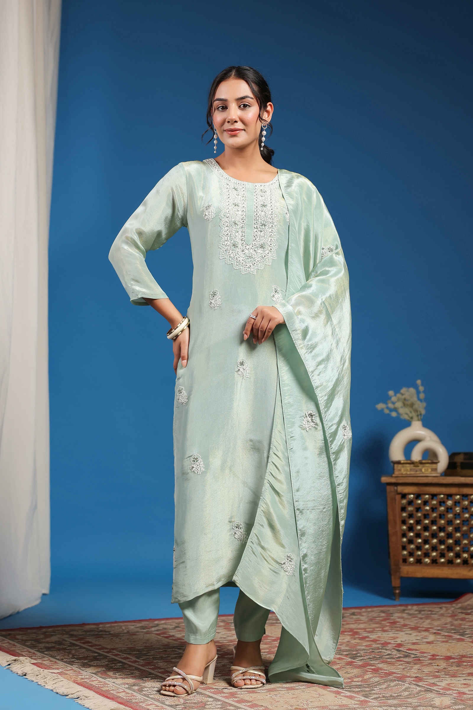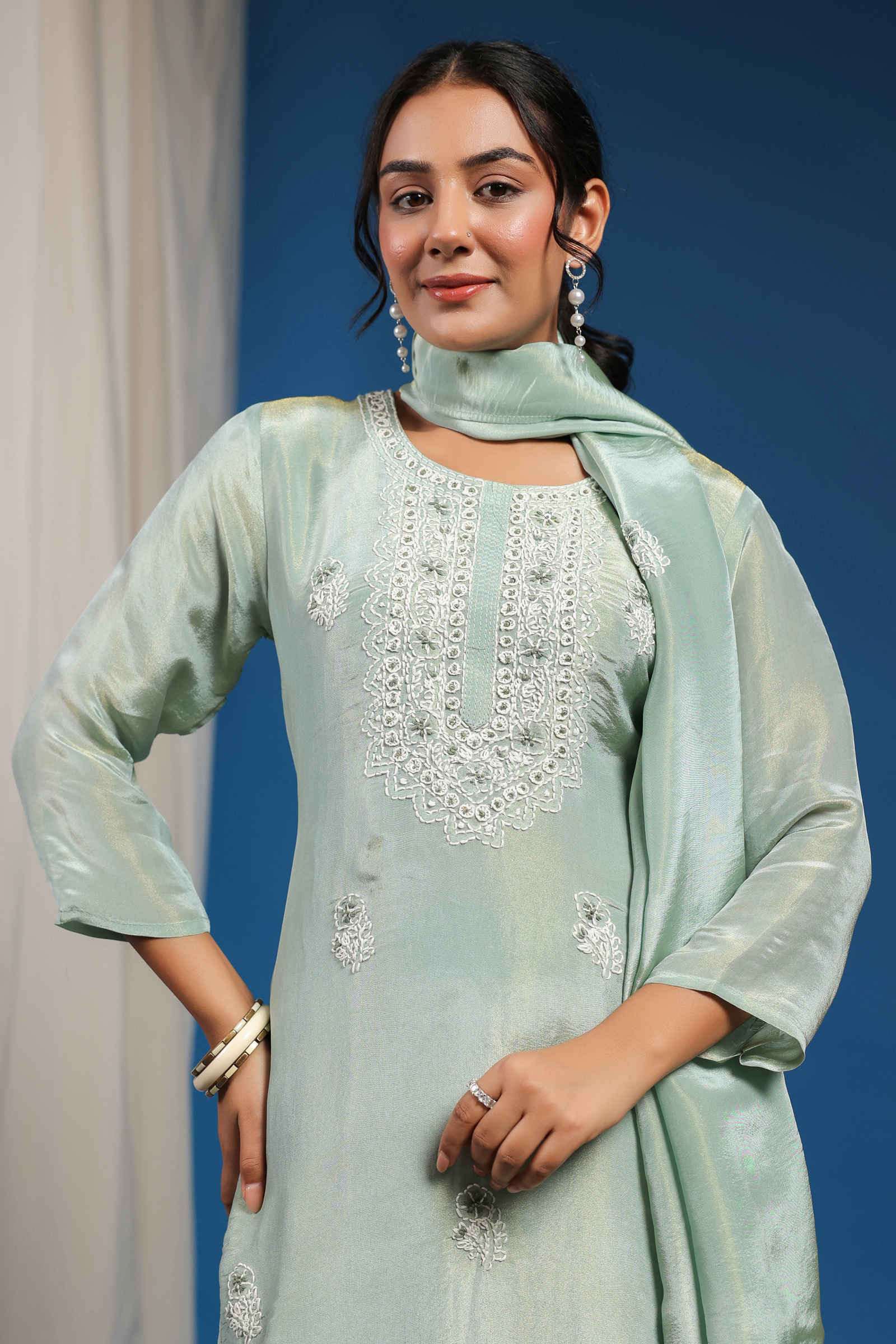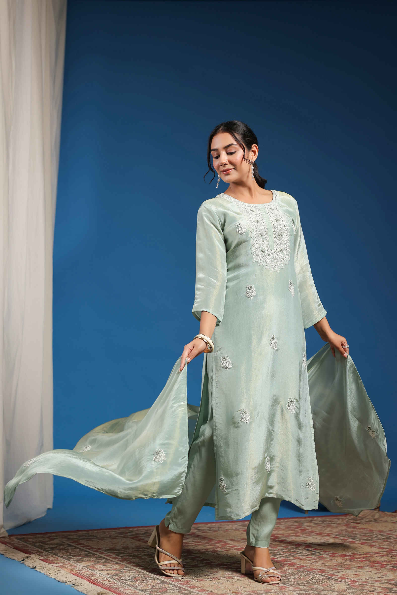 The mint green kurta showcases delicate white embroidery along the neckline and scattered floral motifs across the fabric, giving it a graceful and understated charm. The pant features matching embroidery on the hem, while the luxurious dupatta with subtle floral accents and a soft sheen adds an elegant finish to the look.
