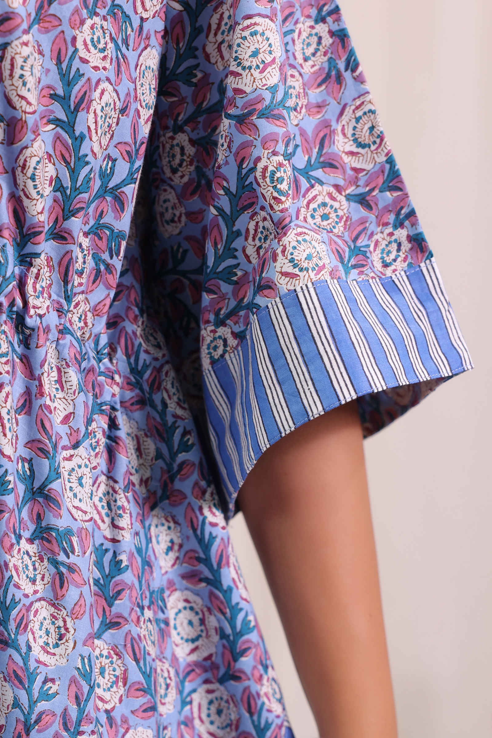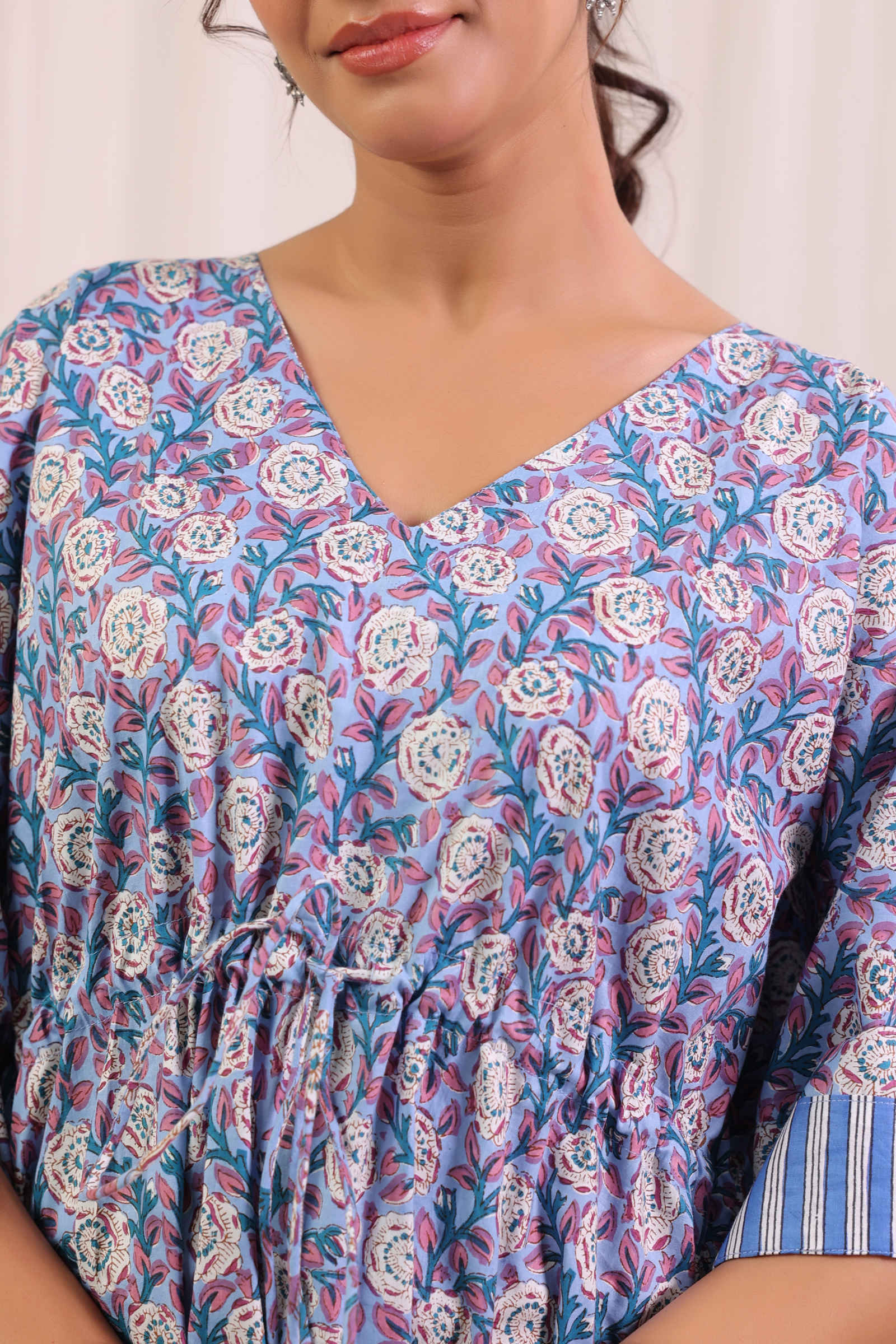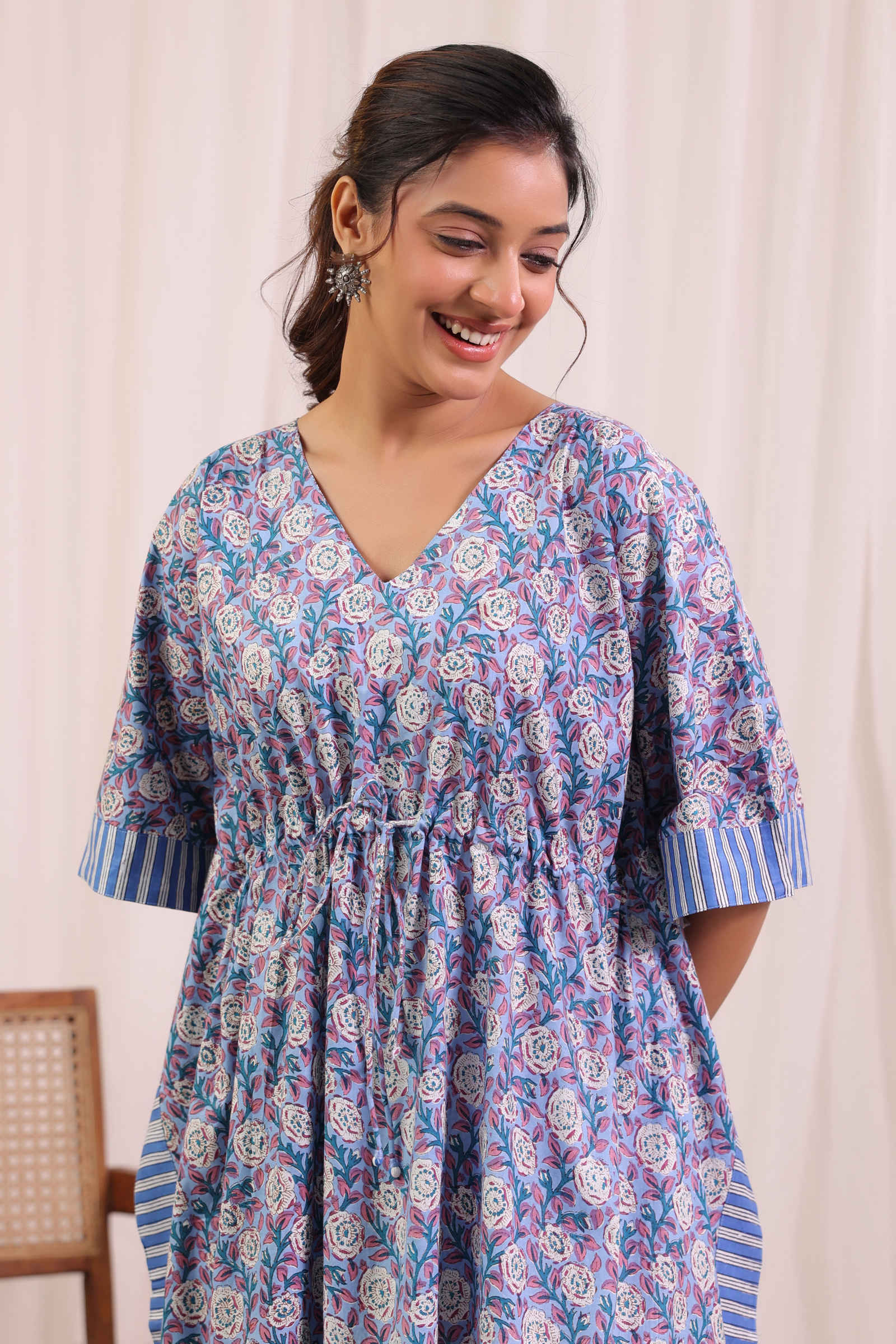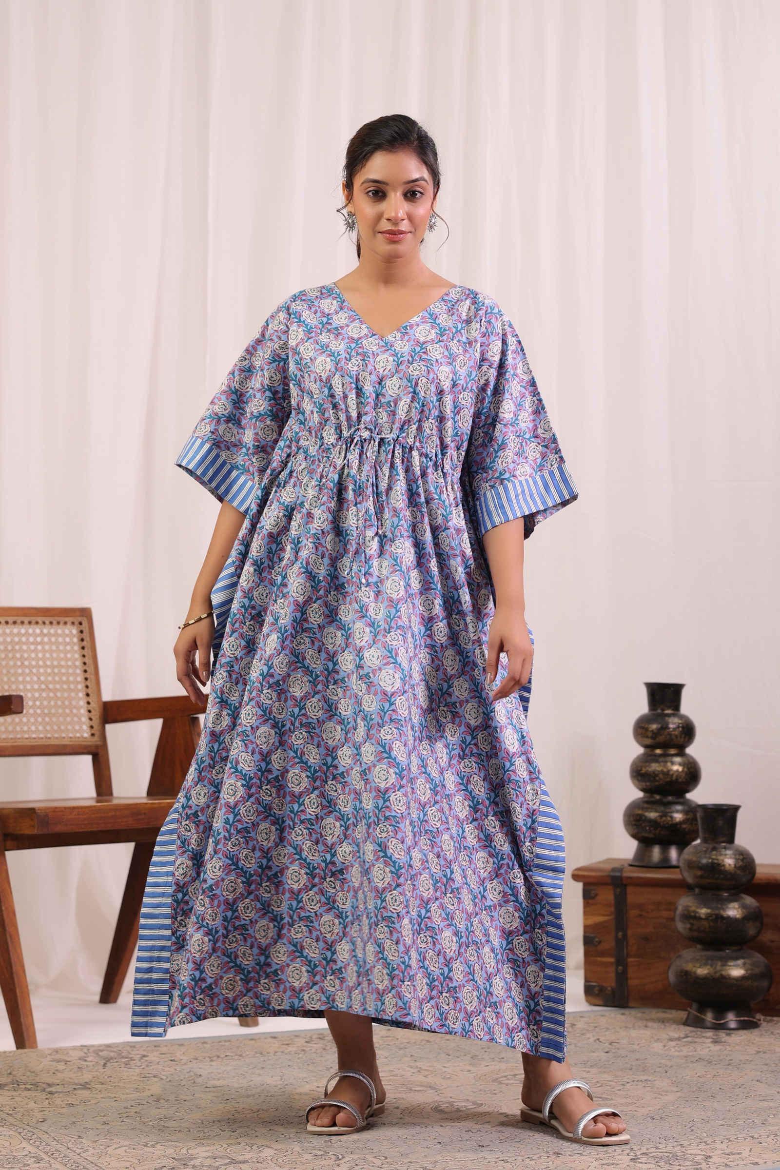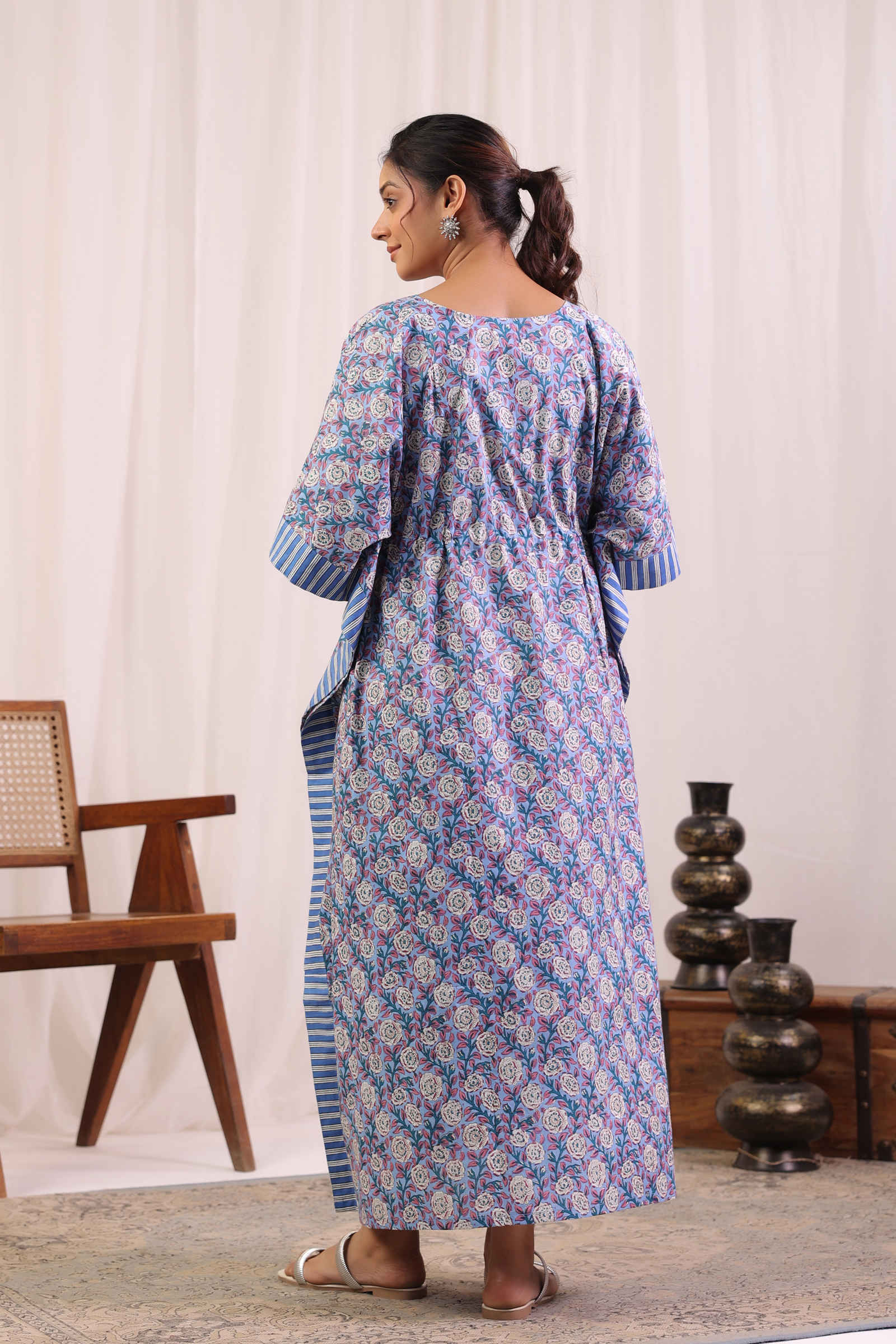 Step into serene elegance with the Fayra Floral Bliss Blue Kaftan. This calming blue kaftan features a romantic all-over floral block print in soft shades of white, lavender, and pink. Accentuated with striped blue borders on the sleeves and side panels, it combines sophistication with a touch of whimsy.