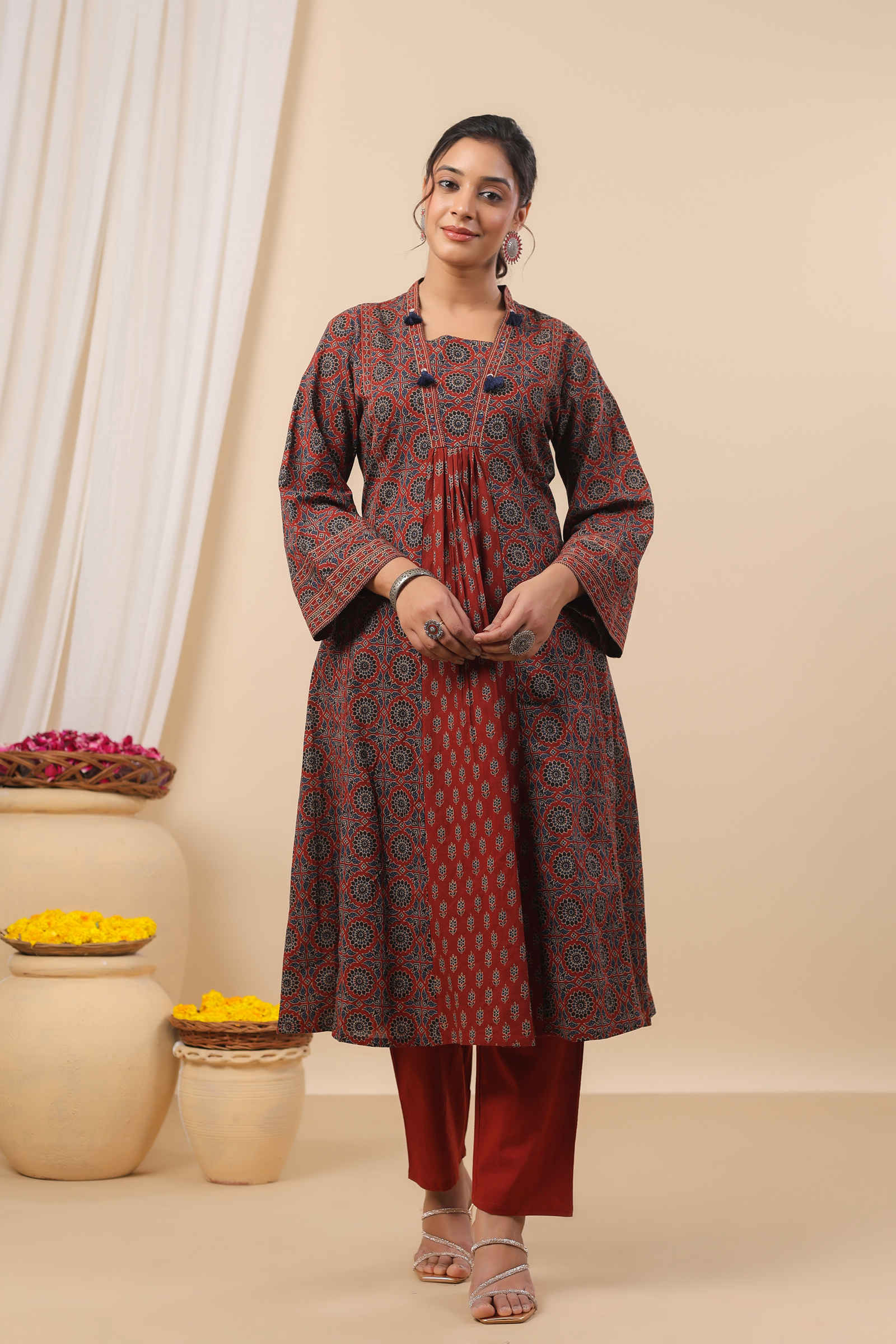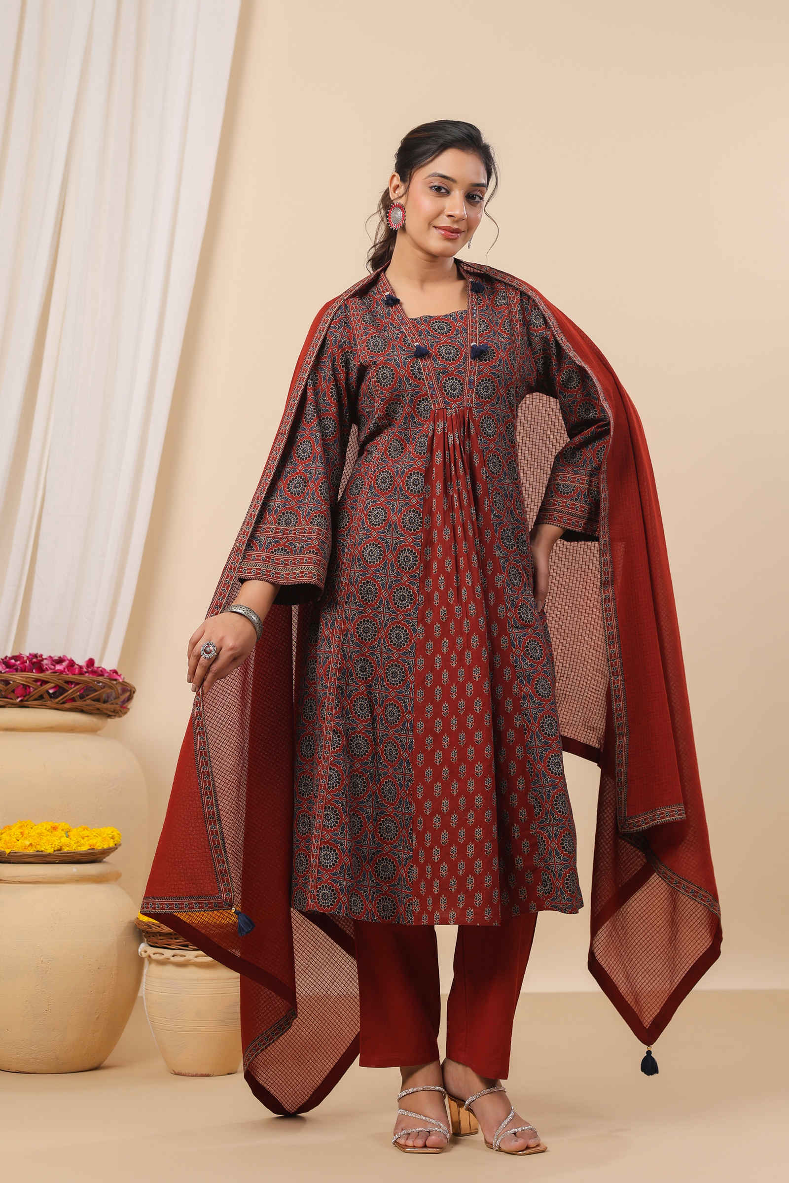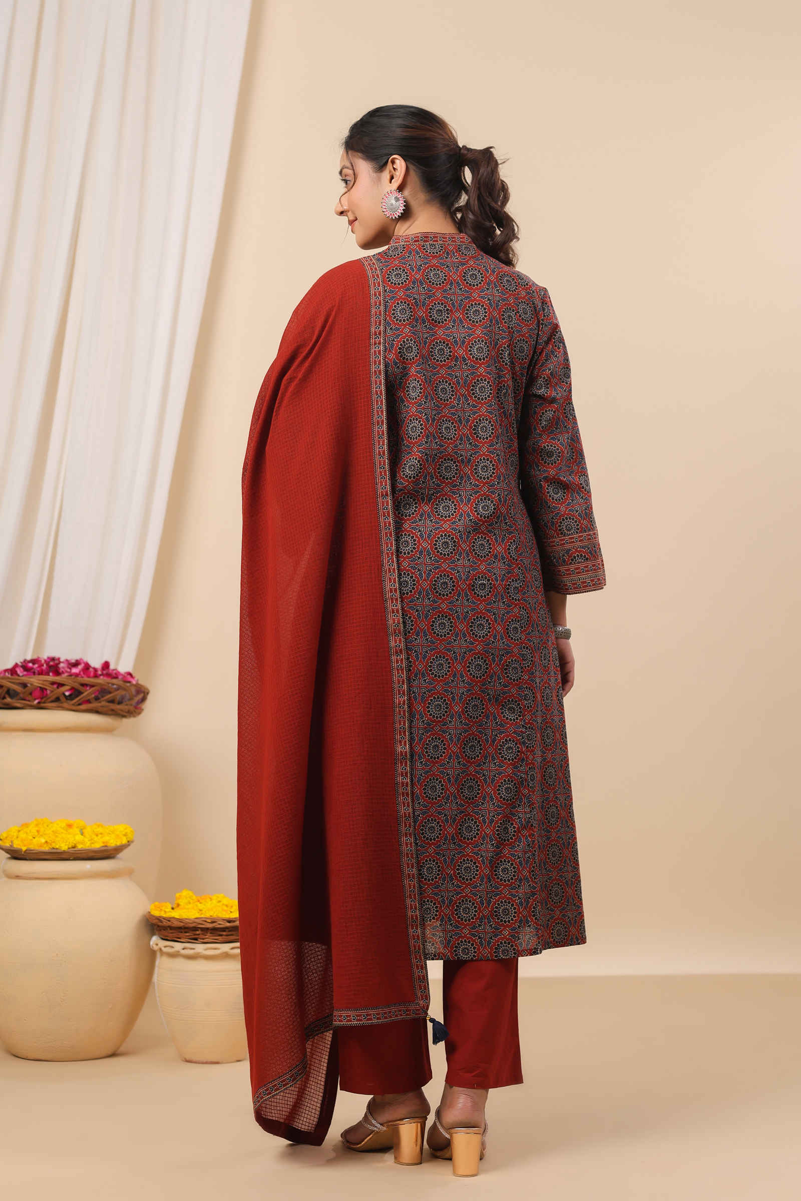 Made from premium cotton, the kurta showcases intricate hand-block prints in striking madder red hues, complemented by delicate embroidery work. The straight-cut pants offer a comfortable yet stylish fit, while the dupatta, adorned with a beautifully bordered finish, completes the look with sophistication. Perfect for festive occasions, gatherings, or casual elegance.