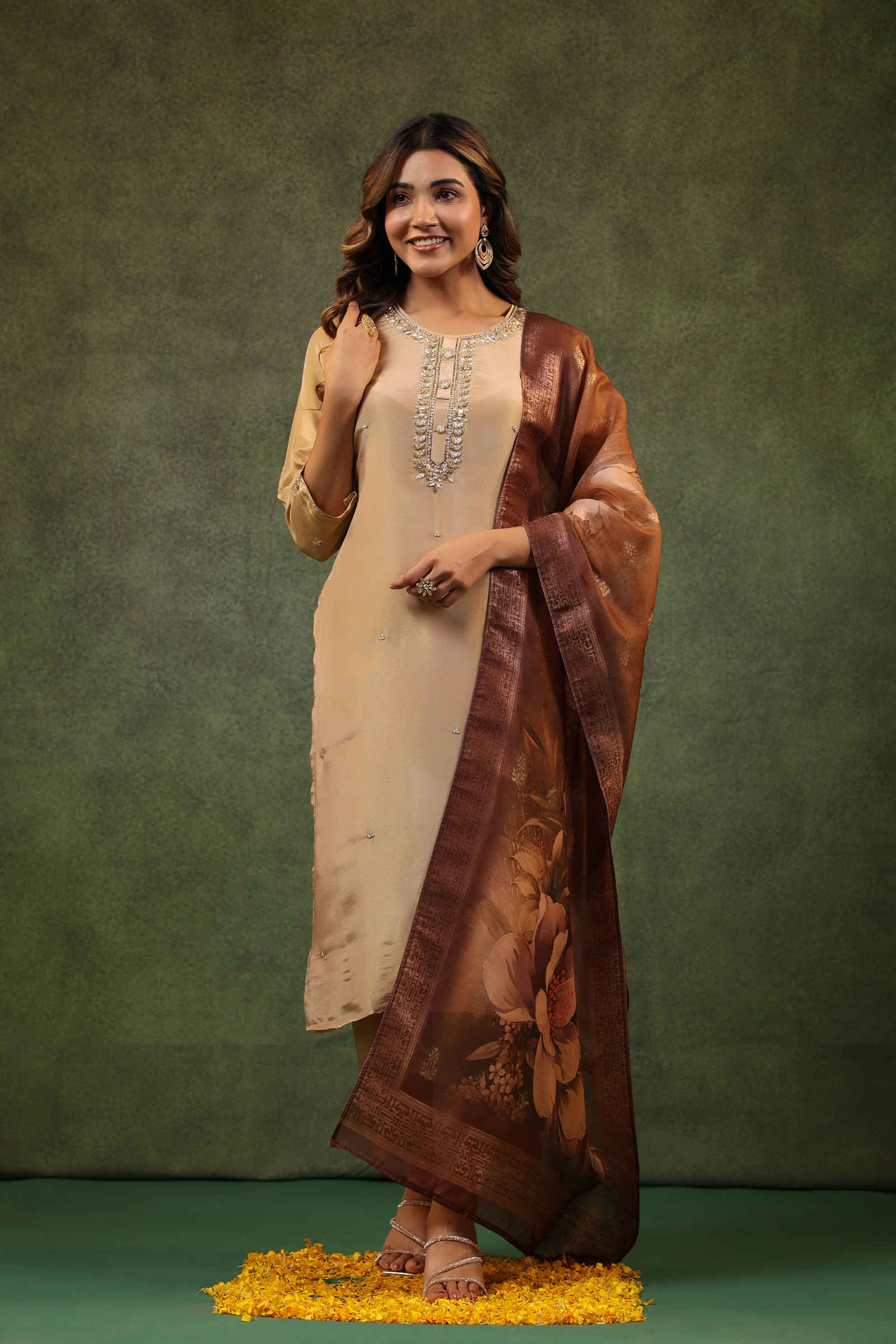 Crafted from Shimmer Muslin, the kurta features a delicate embroidery detail along the neckline and sleeves, enhancing its regal appeal. The elegant champagne hue reflects light beautifully, adding a soft, luminous charm. The matching pants provide comfort while maintaining the outfit’s effortless elegance. The set is completed with a stunning dupatta, adorned with a floral motif and a rich border, lending a touch of grandeur to the look.