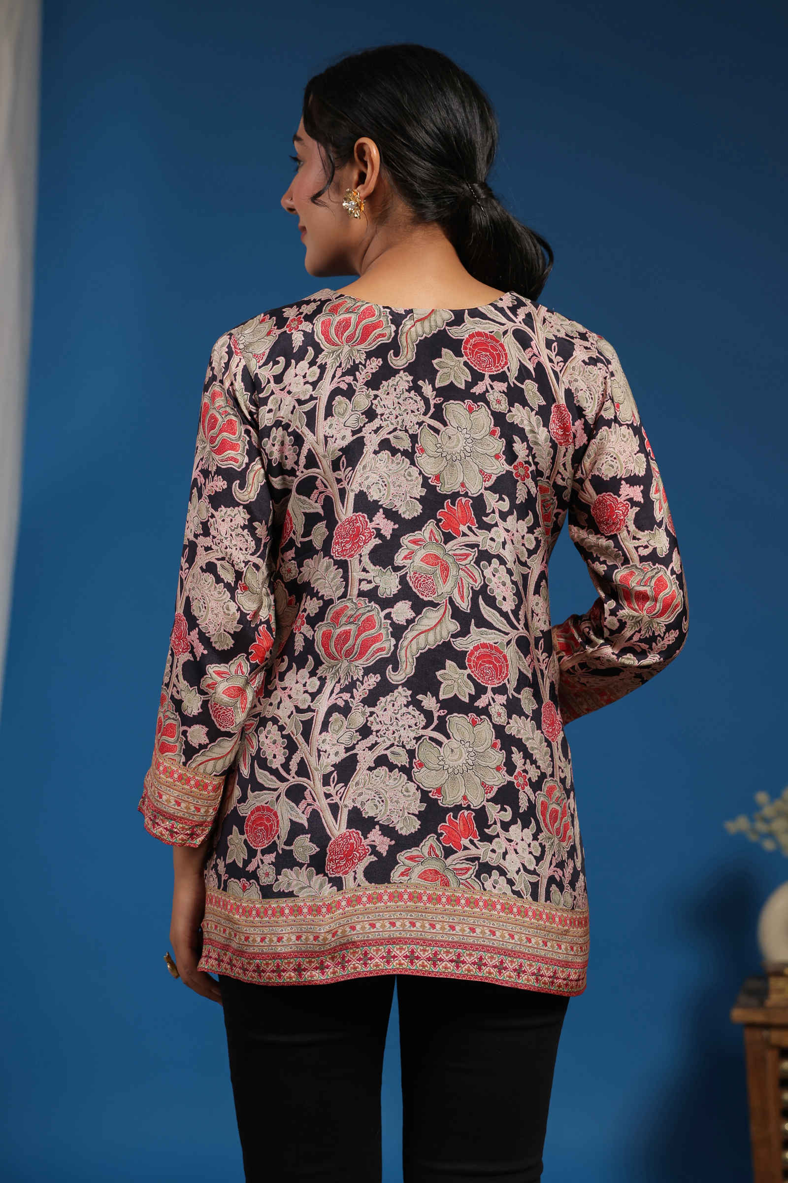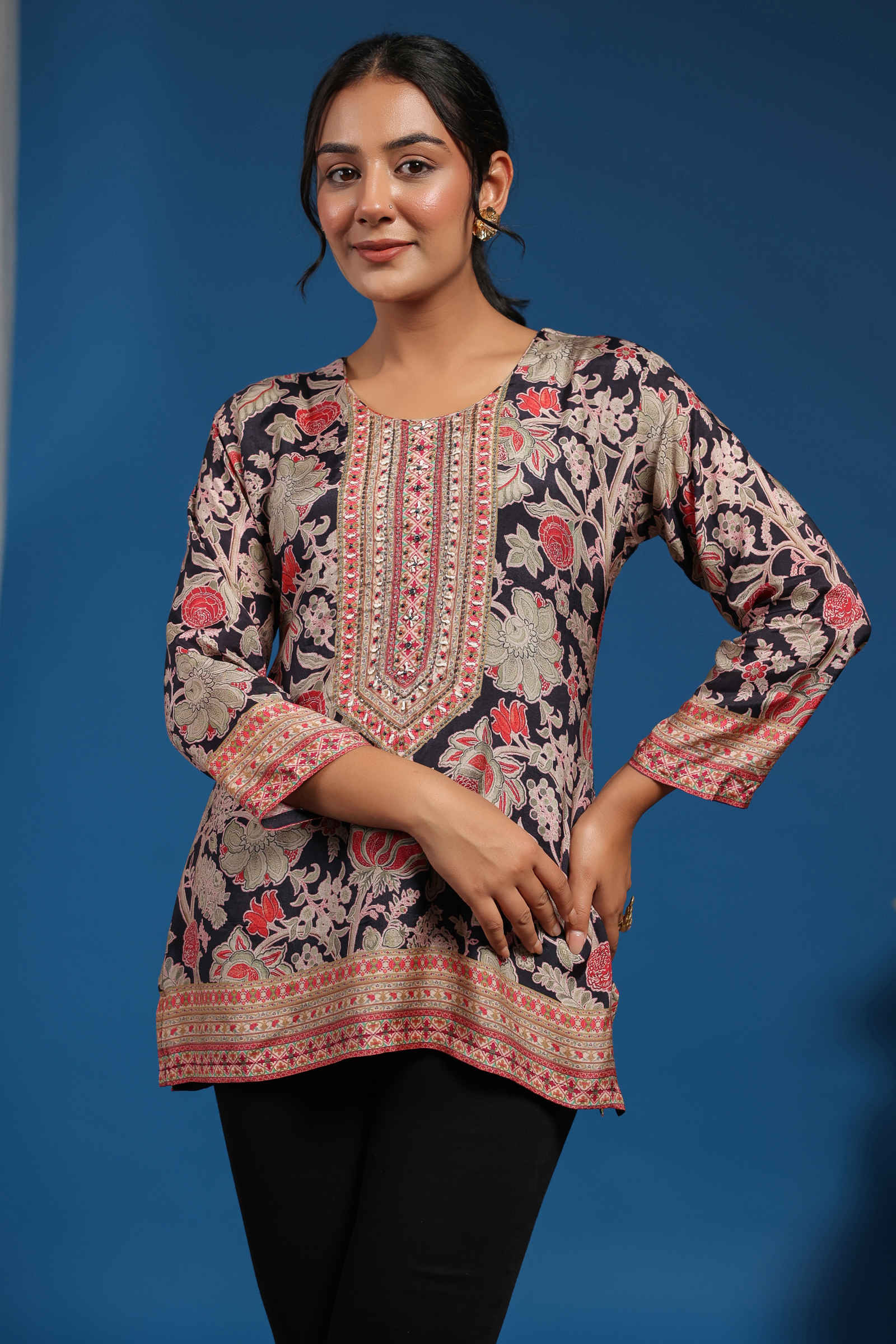 The Naqsh-e-Zara Top features a classic round neckline with elaborate handwork that highlights the delicate floral motifs. The three-quarter sleeves are adorned with matching intricate borders, enhancing the overall elegance. Crafted in luxurious crepe fabric, it offers a comfortable yet stylish fit, making it perfect for casual outings and festive occasions alike.