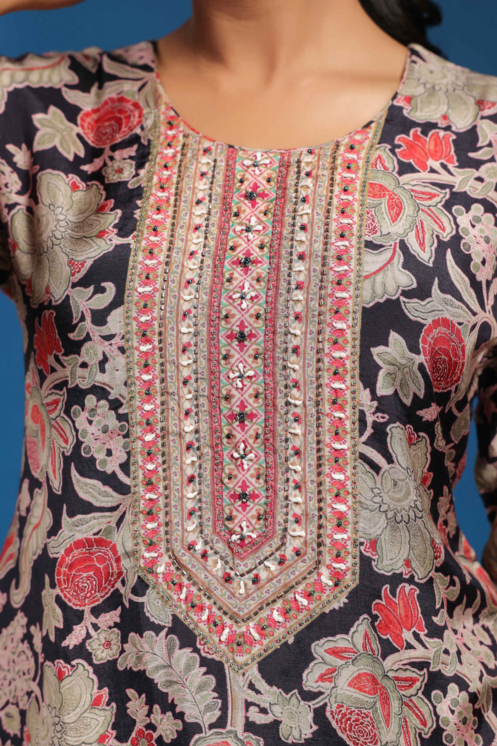 Black with Red and Beige Floral Handwork |