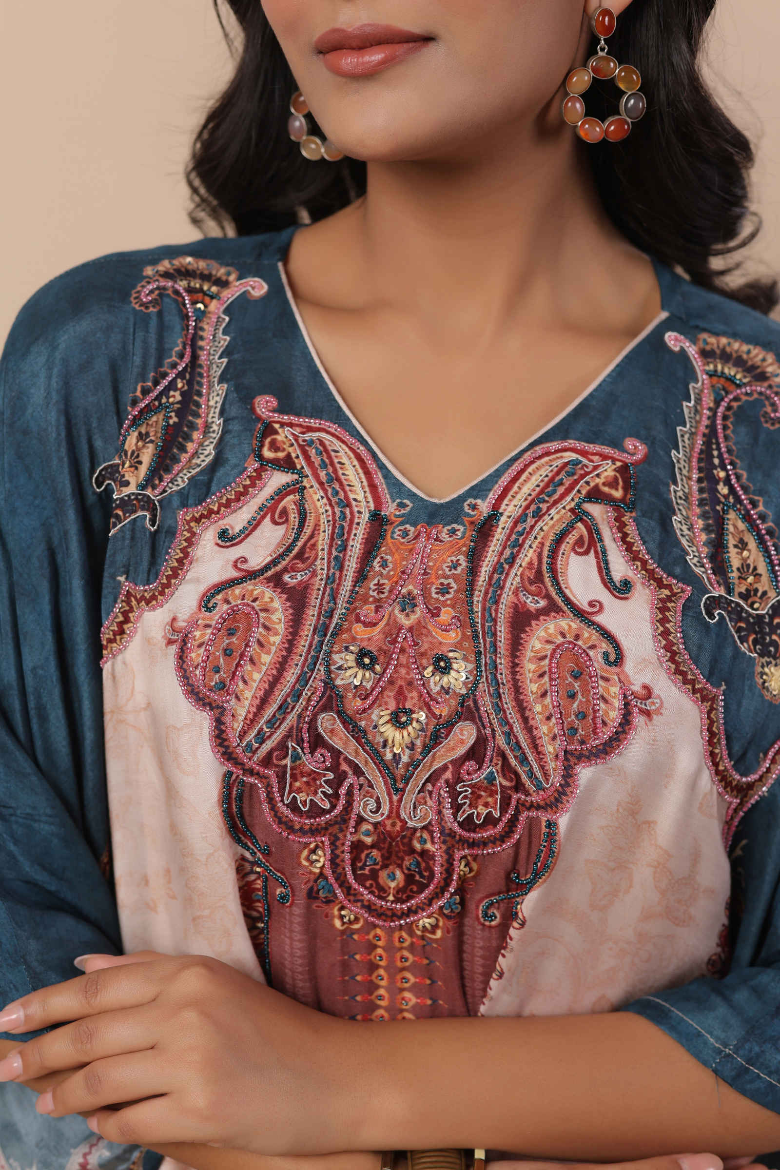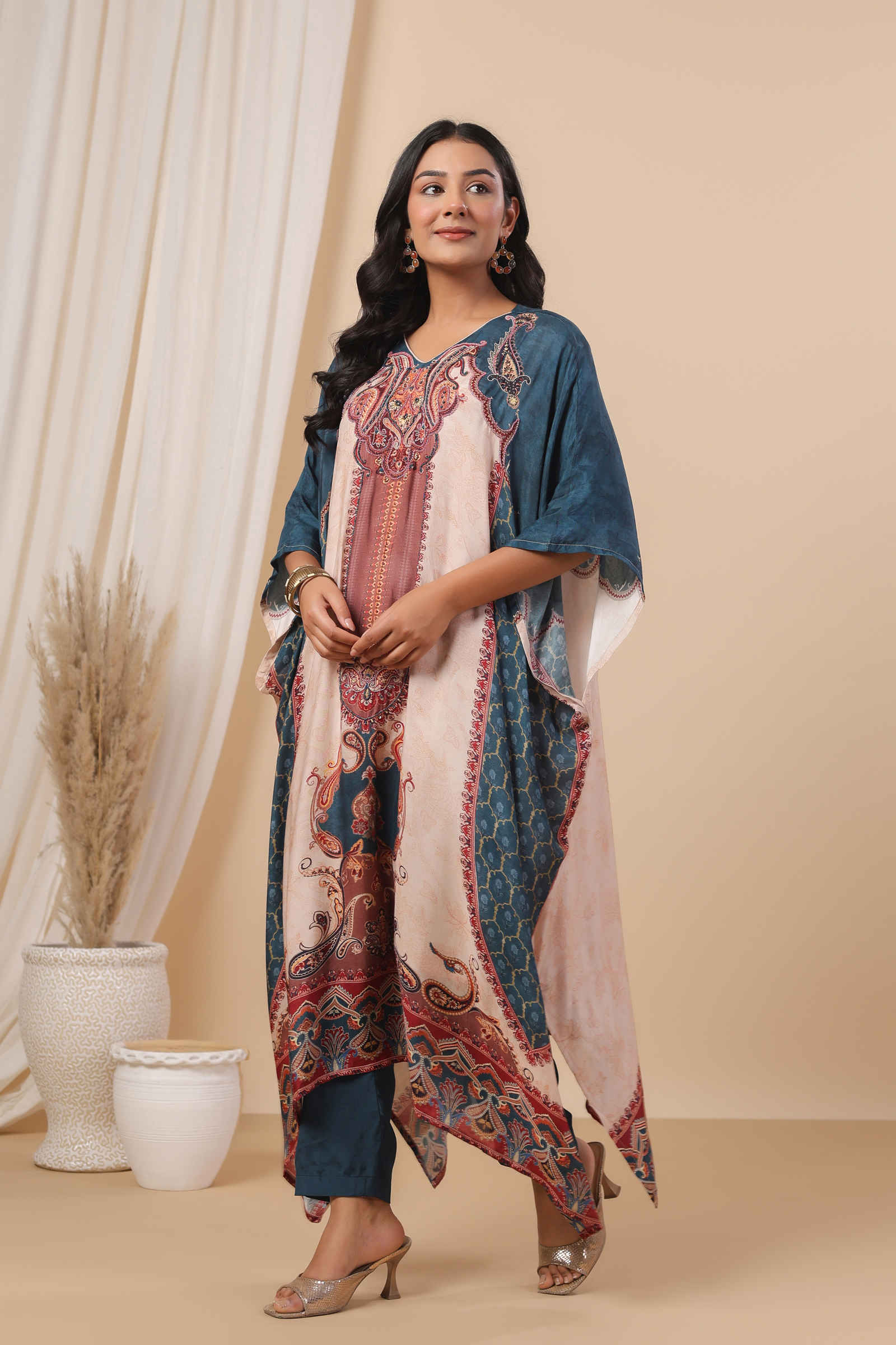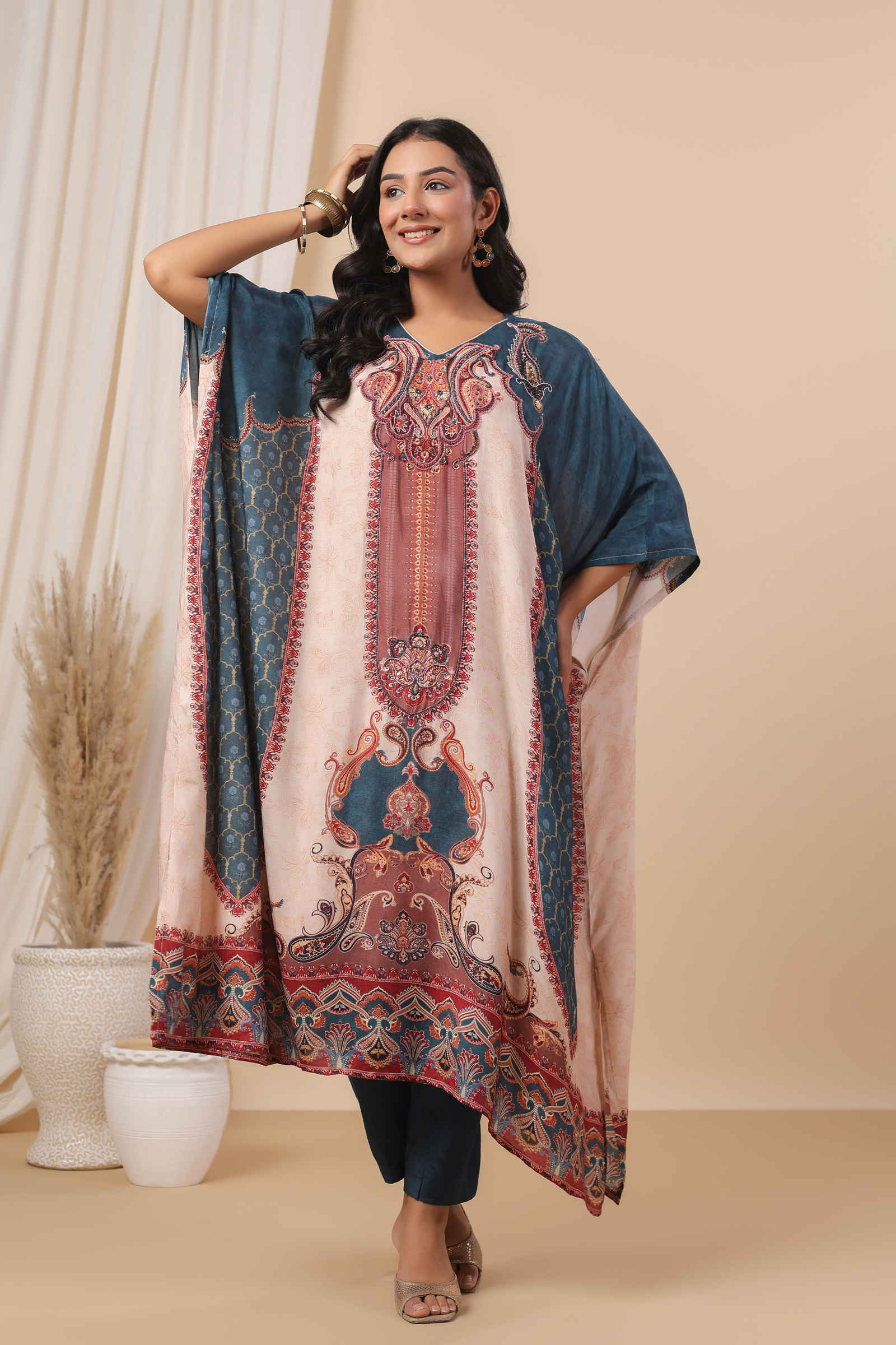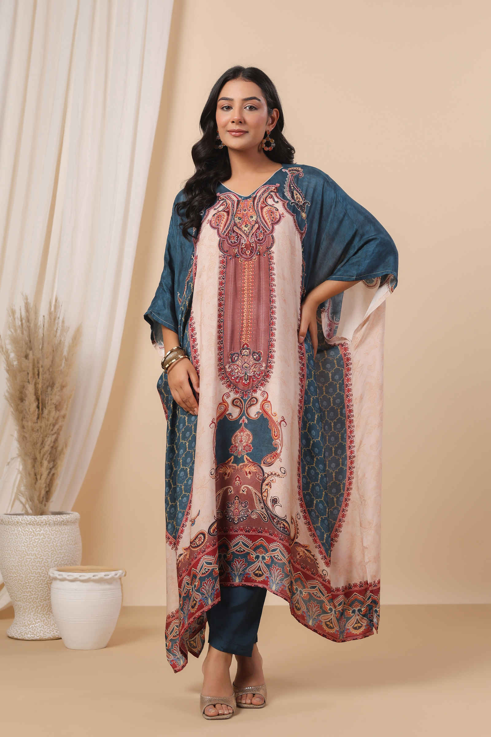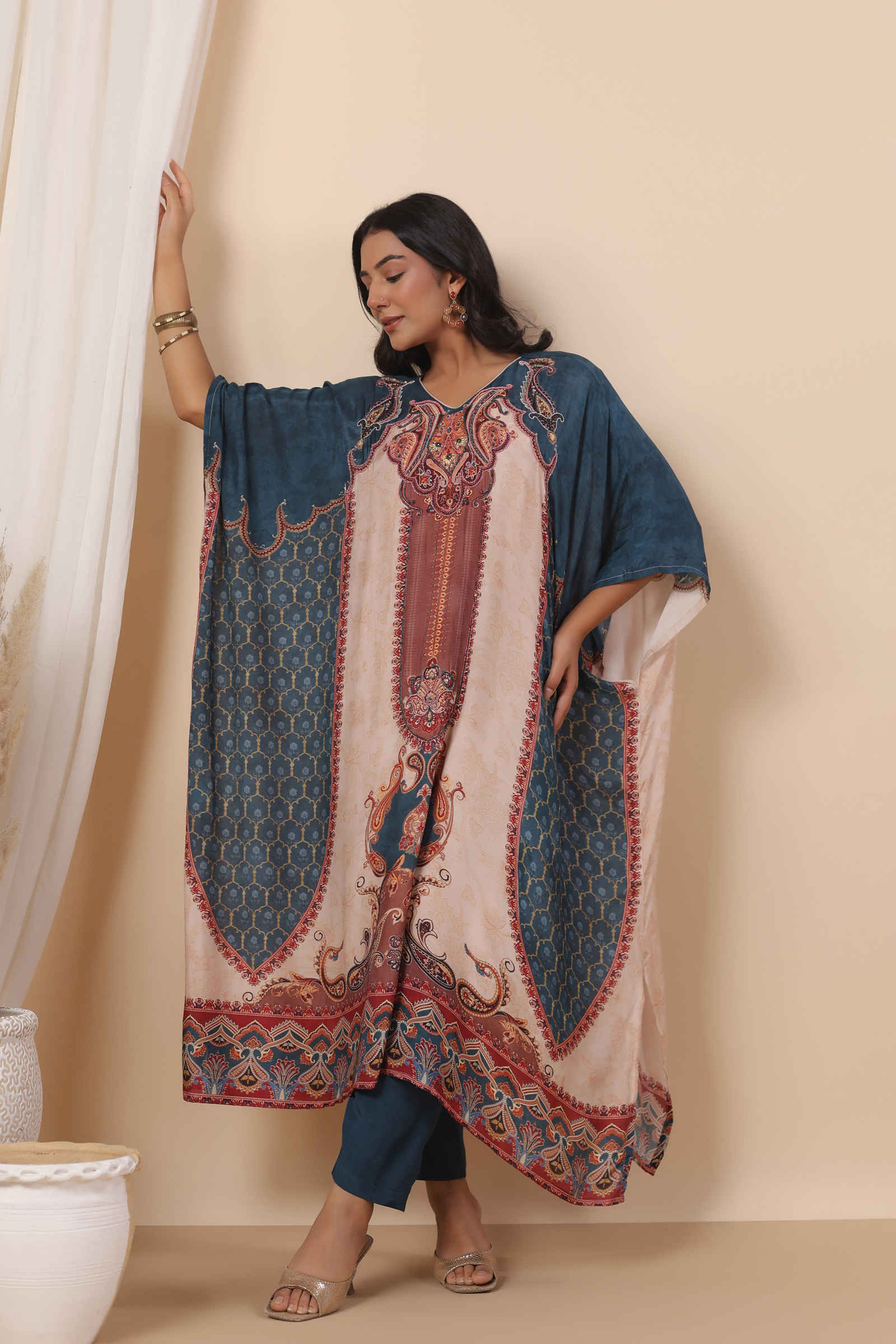 The kaftan features a delicately embellished neckline with stunning motifs that flow seamlessly across the fabric. Its relaxed, airy silhouette ensures a flattering drape, offering both style and comfort. Paired with a coordinating inner and tailored pants, this ensemble is ideal for festive gatherings, cultural celebrations, or refined daywear.
