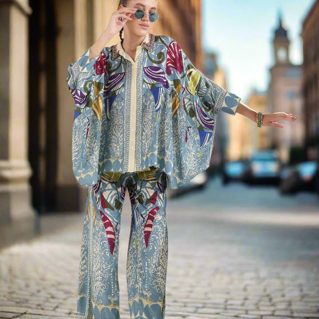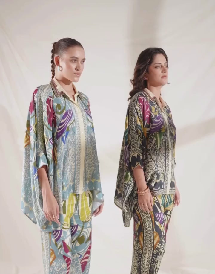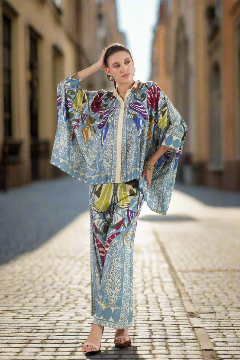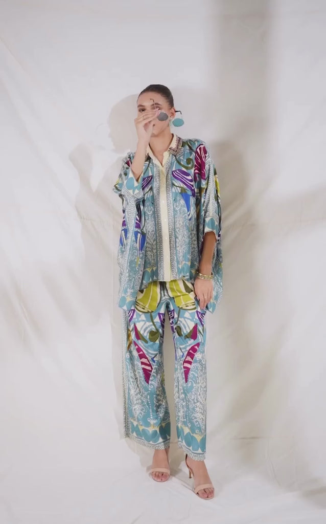 Introducing the Ocean Whimsy Blue Co-ord Set - Set of Two, a statement outfit designed for effortless elegance. This two-piece set features a flowy button-down shirt and wide-legged trousers adorned with a mesmerizing blend of botanical and abstract prints. Whether for a casual brunch, a vacation escape, or a festive evening, this co-ord set ensures both comfort and sophistication. Crafted from premium, lightweight viscose muslin, it offers breathability and an elegant drape.