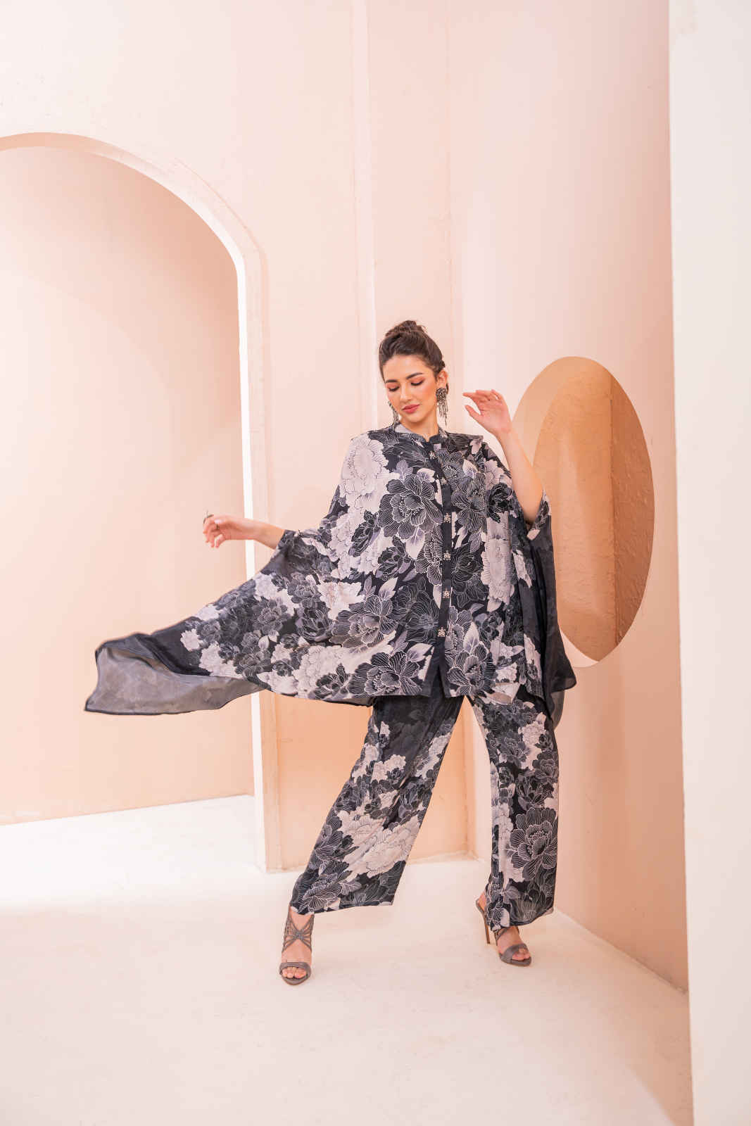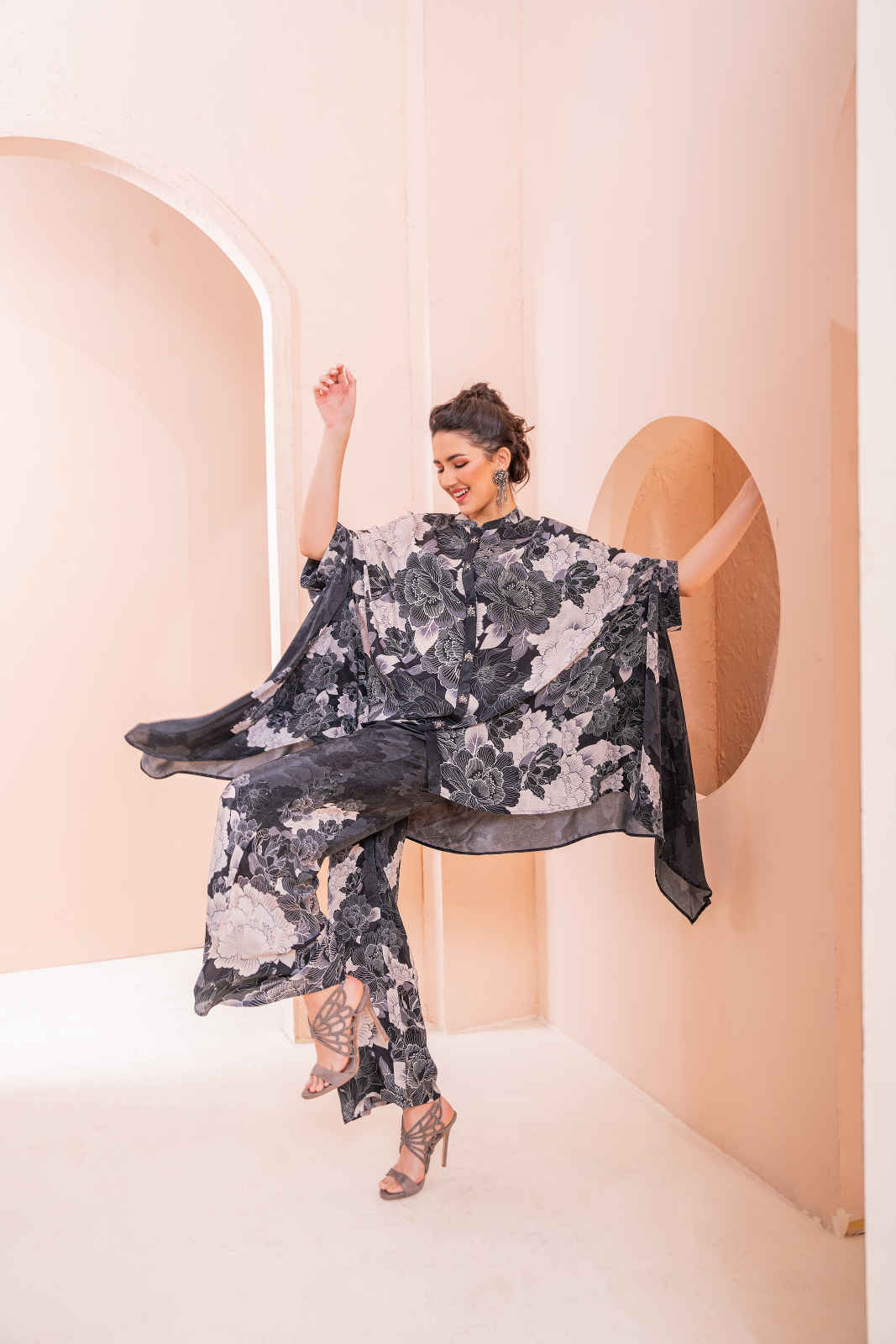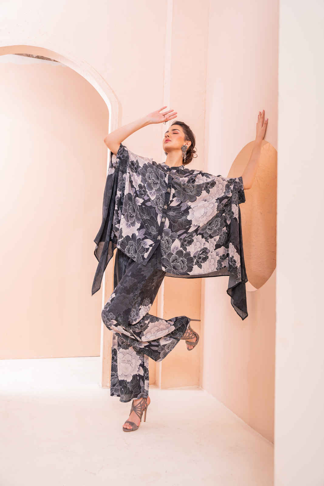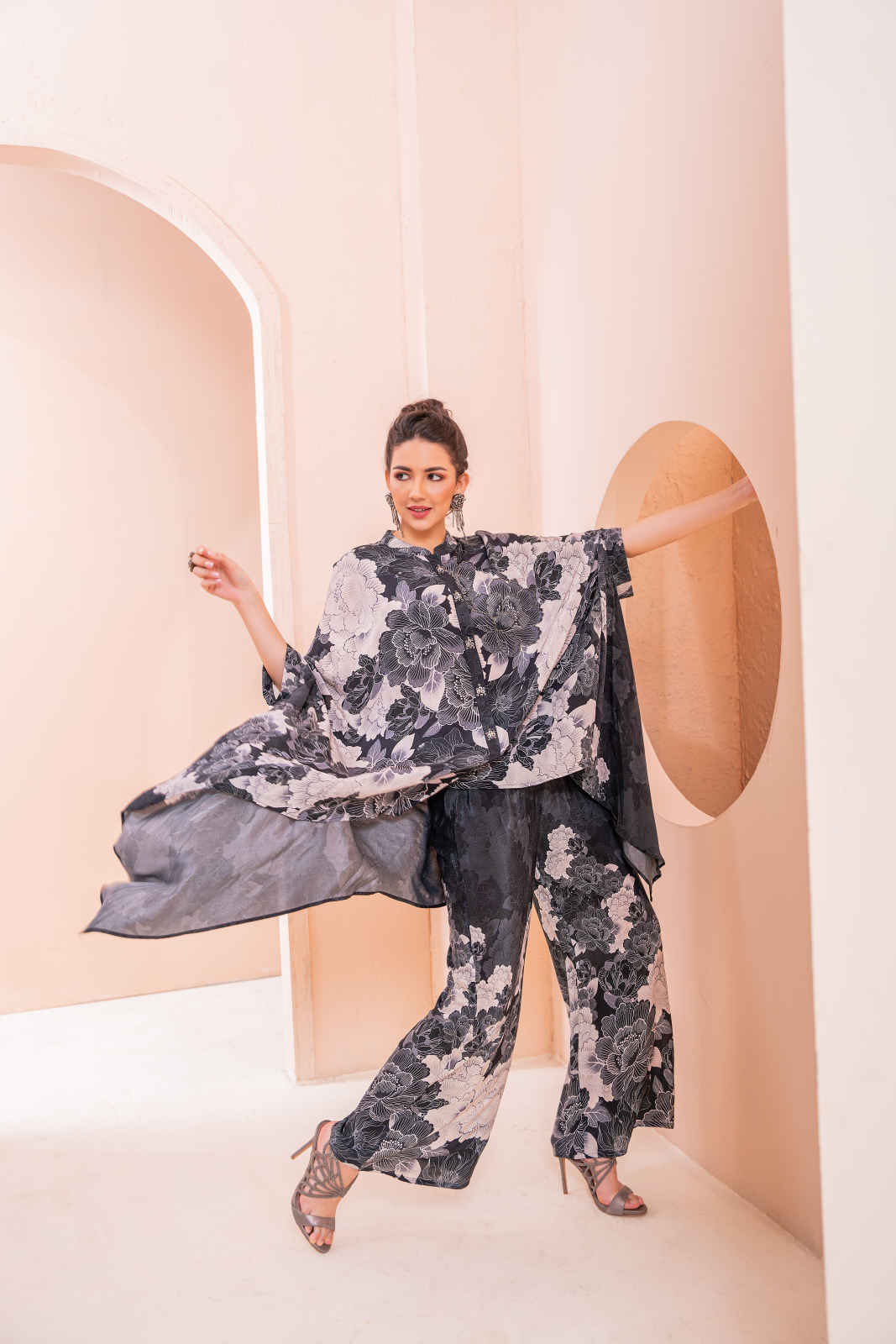 Introducing the Shadow Petals Cape Co-ord Set – Set of Two, a refined fusion of elegance and contemporary style. This two-piece ensemble features a flowy cape-style top adorned with intricate monochrome floral patterns, paired with complementing wide-leg pants. The striking black and grey contrast, coupled with a breezy silhouette, makes it a perfect choice for evening gatherings, festive celebrations, and sophisticated outings. Elevate your wardrobe with this statement-making outfit that blends comfort with high fashion.