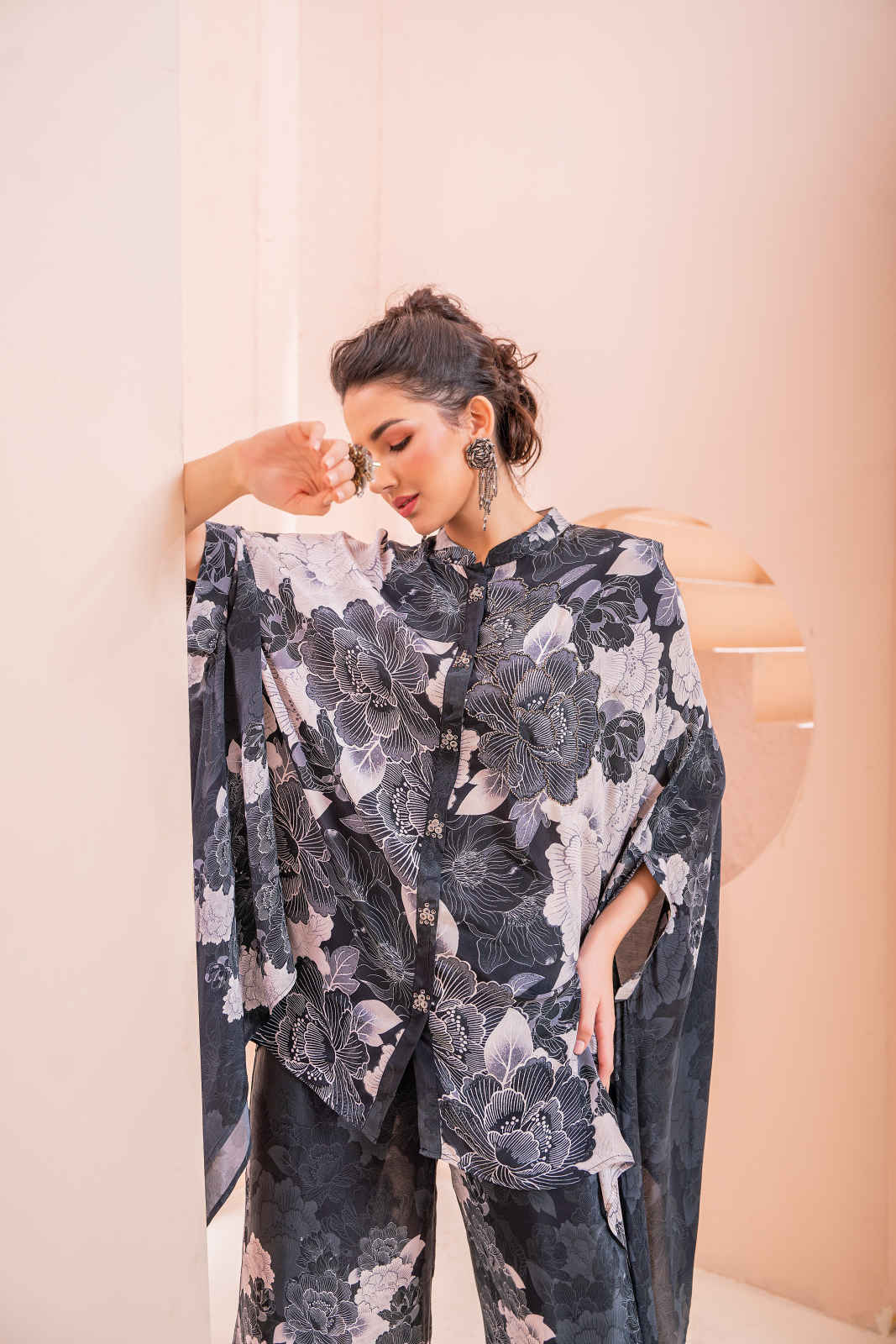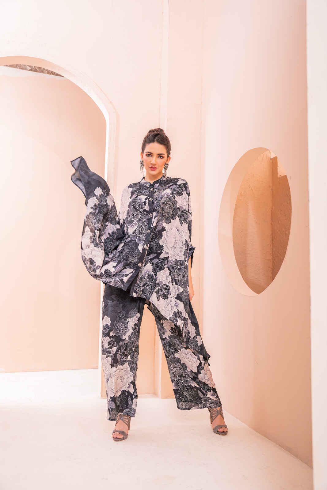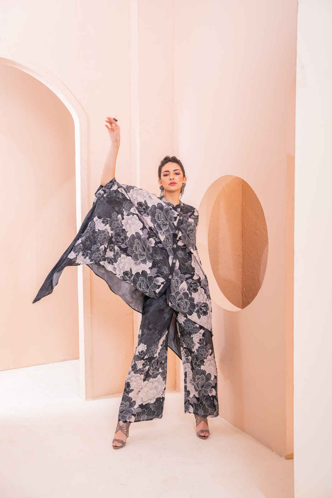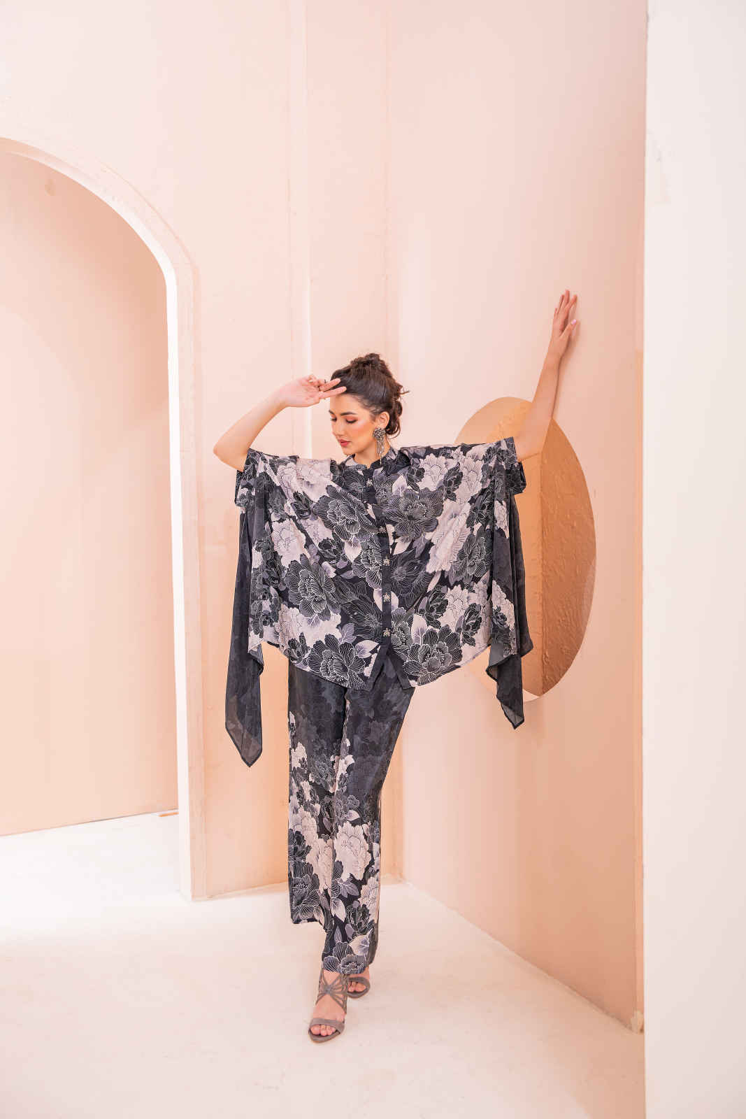 Introducing the Shadow Petals Cape Co-ord Set – Set of Two, a refined fusion of elegance and contemporary style. This two-piece ensemble features a flowy cape-style top adorned with intricate monochrome floral patterns, paired with complementing wide-leg pants. The striking black and grey contrast, coupled with a breezy silhouette, makes it a perfect choice for evening gatherings, festive celebrations, and sophisticated outings. Elevate your wardrobe with this statement-making outfit that blends comfort with high fashion.